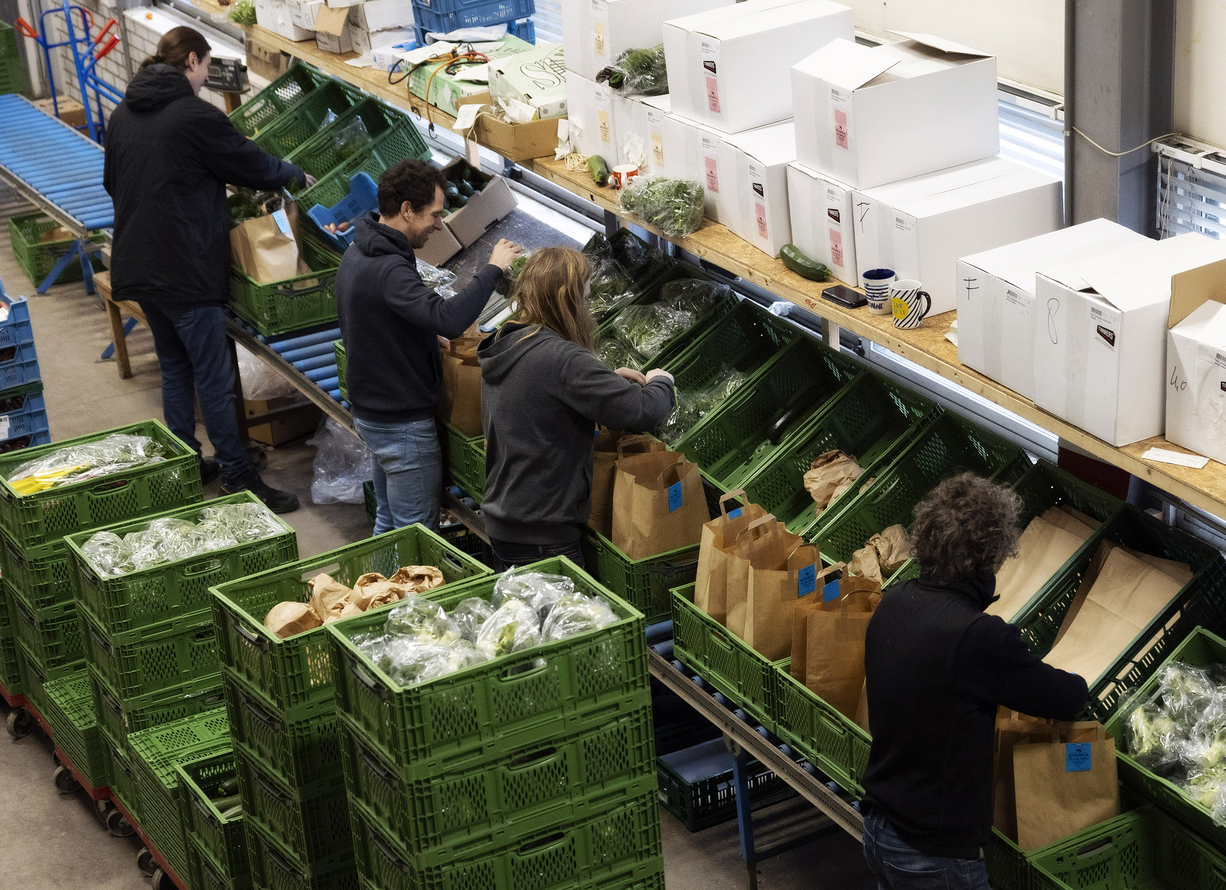 Daarna worden de pakketten gedraaid, vier, vijf Kieviters op een rijtje, de kratjes zoeven voorbij, iedereen doet zijn of haar producten in de tas en geeft de krat weer een zwiep naar de volgende persoon. Daarna meteen op routes verdelen, negen verschillende groentepakketten, de fruitpakketten, de bij-abonnementen, de bestellingen droog en vers en wacht even, de broden, die worden nu verdeeld, je kan over vijf minuten vertrekken!