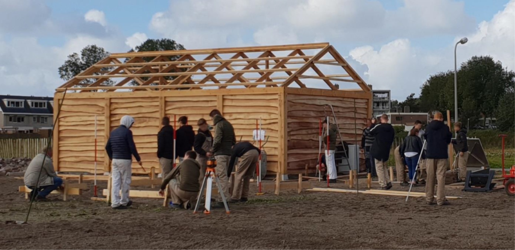 Gister hadden we de technische school Rijnmond op het erf. We zitten volop in de bouw van twee schuren. Schuur één gaat vlot en de kapschuur kan worden uitgezet. De scholieren hadden een practicum palen uitzetten. Belangrijk werk, want bij een scheve meting hebben wij straks een schuine kapschuur! Ondertussen daalden ook de oktoberbuien op de jeugdige schedels neer en hierdoor worstelden enkelen met essentiële bestaansvragen. Zoals: ‘Waarom ben ik op deze aarde’ en ‘Meneer, mogen we weer naar binnen?’ Toch was het een mooie dag, eigenlijk ook een regenstage! Aan het einde hadden er een paar ontdekt dat ze toch niet van suiker waren, een waardevolle ontdekking!