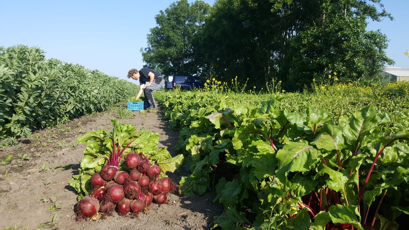 Met plantkarretjes op een geprepareerd plantbed hebben we duizenden zogenaamde perspotjes in de grond gezet. Eerst werden ze afgedekt met folie, later mochten ze groeien in de vrije buitenlucht. Het was koud, het was warm, het was droog en het was nat, maar gelukkig zijn de plantjes prima doorgegroeid.En nu is het dan zover, we kunnen oogsten. Eerst nog het intensieve ‘dooroogsten’, op zoek naar de volgroeide bietjes in het veld. Op elk perspotje groeien meestal drie bietjes en die zijn niet allemaal even snel volgroeid. Op zoek naar de volgroeide bietjes lopen we over het land. De goede bietjes trekken we er voorzichtig eruit, zodat de anderen blijven zitten. Elastiekje erom en het bosje is klaar!We hopen dat je er even blij van wordt als wij.