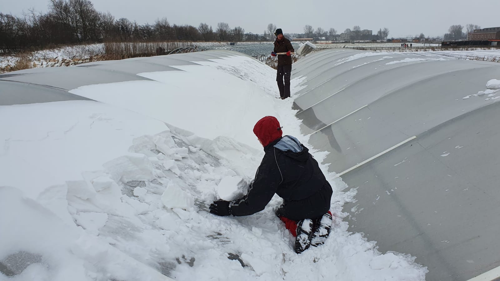 Nou, daar betaalden wij afgelopen zondag de prijs voor! Zonder strijd geen overwinning. Met een gevoelstemperatuur van minus 173 graden in de wind, moesten we het dak op van de kas. De rap aangroeiende sneeuwmassa moest worden verwijderd. Je weet namelijk niet hoe het aangroeien der sneeuwmassa eindigt. Een laag van 25 centimeter sneeuw weegt ongeveer 50 kilo per vierkante meter en de kas is berekend op de helft. En 25 cm, dat lag er al snel.Dus de grimmige moraal van het verhaal: als je heimelijk warm wilt werken, dan sta je plots in de vrieskou. Laat dit een ijzingwekkend voorbeeld zijn voor het nageslacht.