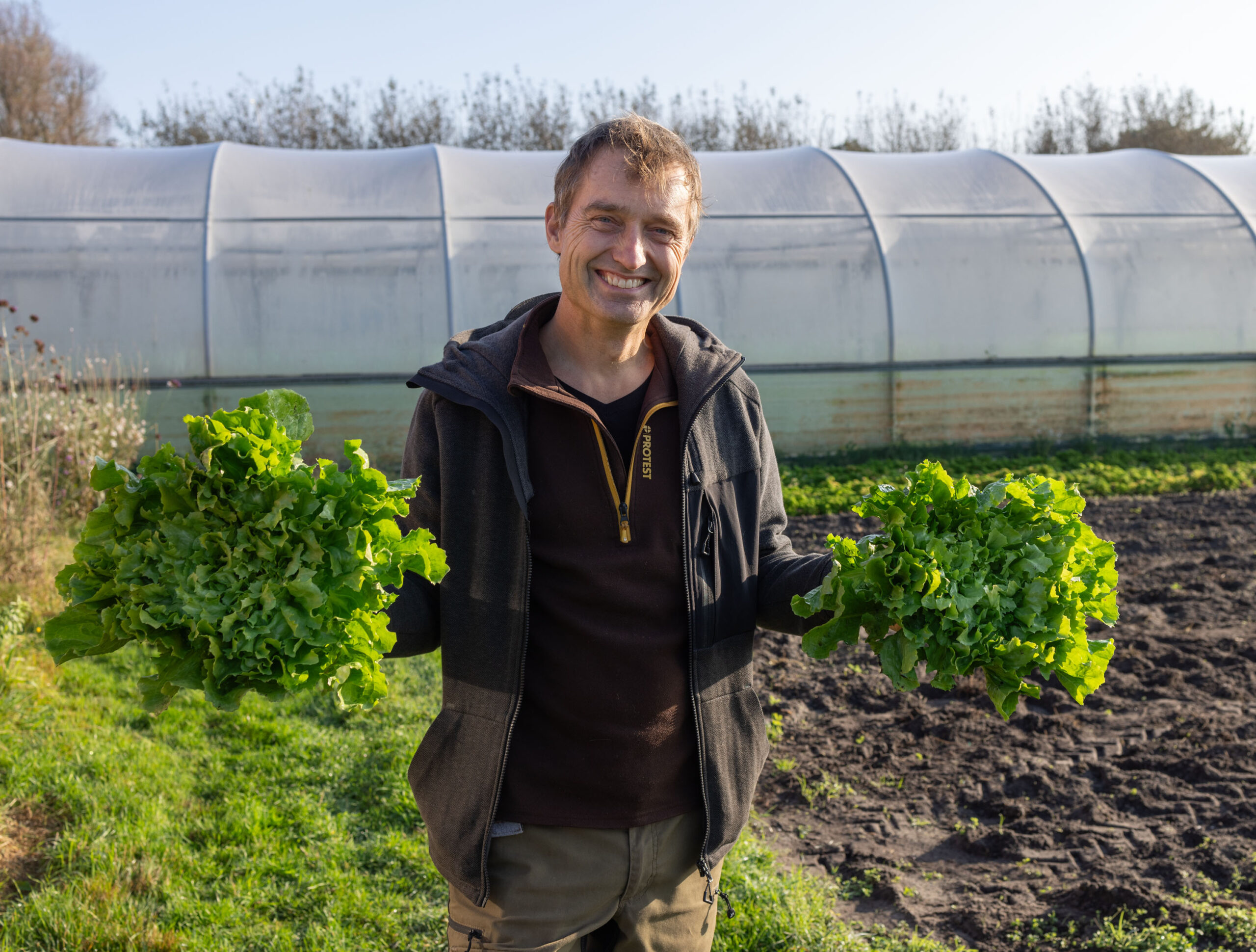 Je hebt echte bewaargroenten zoals koolraap, rode kool, bieten, winterpeen, maar we houden ook erg van blaadjes. Vaak boordevol vitamines, mineralen en gelukstofjes. Vandaar dat elke tuinder probeert deze categorie zowel vroeg in het seizoen, als laat in de herfst nog te telen. Het is ook onze plicht, zo dienen we de wereld, etc. etc. Helaas, ondanks het wereldheil zijn die vroege en late oogsten altijd nogal risico-vol. De lente en de herfst zitten vol grillen, die malse blaadjes aardig naar het leven kunnen staan. Met de juiste rassen en teeltmaatregelen en heel veel tuindersliefde komen we een heel eind. Wel toegegeven, de producten zijn wel wat kleiner dan in de zomer. Wie weet dat we dat in het volgende seizoen nog wat kunnen beïnvloeden met verdere optimalisatie van rassen en perceelkeuze. Ja, je leest het goed, dat is weer een plantaardige flash forward van heb ik jou daar.