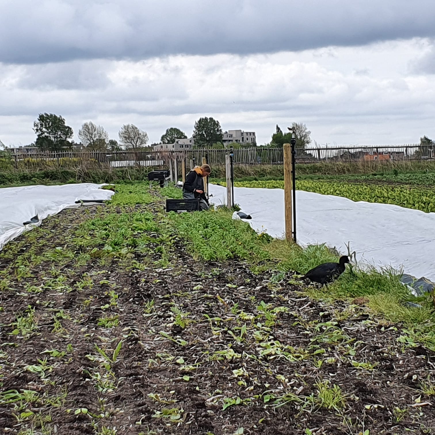 Ze bedekken de grond, doorwortelen de grond en halen mineralen van diepere grondlagen omhoog. De dieren eten ervan en de kringloop is al bijna rond. Het enige probleem is, ze concurreren stevig met onze groenteplantjes. Dus wij van de firma Kievit zijn niet naïef (‘Oh wat fijn voor de aarde!’) en gaan de spontane kruidjes met verve te lijf. Schoffels, hakken, cultivatoren, wiedvingers, geen inspanning is ons te dol om onze groenten een beslissende voorsprong te geven en te voorkomen dat onkruiden onze groenten wegconcurreren en/of zich stevig uitzaaien. Want één ding moet je ze toegeven, het zijn vaak lekker vruchtbare plantjes. Eén bloeiende melde geeft duizenden jonkies.Meike, onze dochter van 14, heeft lekker veel tijd om te helpen. Op het land werken is fijner dan school en als het schoolwerk af is komt ze graag helpen. Samen met haar oogstte ik veldsla en plukten we wat achterstallig straatgras tussen de bedden vandaan. Maar oei, veel zaadjes vielen al op de grond. Toen kregen we hulp uit onverwachte hoek: meerkoet! Die woont bij ons in de sloot en is inmiddels opvallend tam. Terwijl wij ons keurig aan de 1.50 meternorm houden, komt meerkoet er inmiddels binnen! Dus wederom weer even scherp blijven.. “Meerkoet, alles goed en wel maar één kuchje en we trekken de protocollen weer stevig aan”. Maar goed, meerkoet kucht niet, maar doet geweldig mee! Meike, meerkoet en ik. Wij wieden, meerkoet gras wieden en graszaad pikken. De groenten laat hij keurig staan en zo hij helpt mee om het gras te beteugelen. Gelijktijdig hebben we er leuk gezelschap aan.