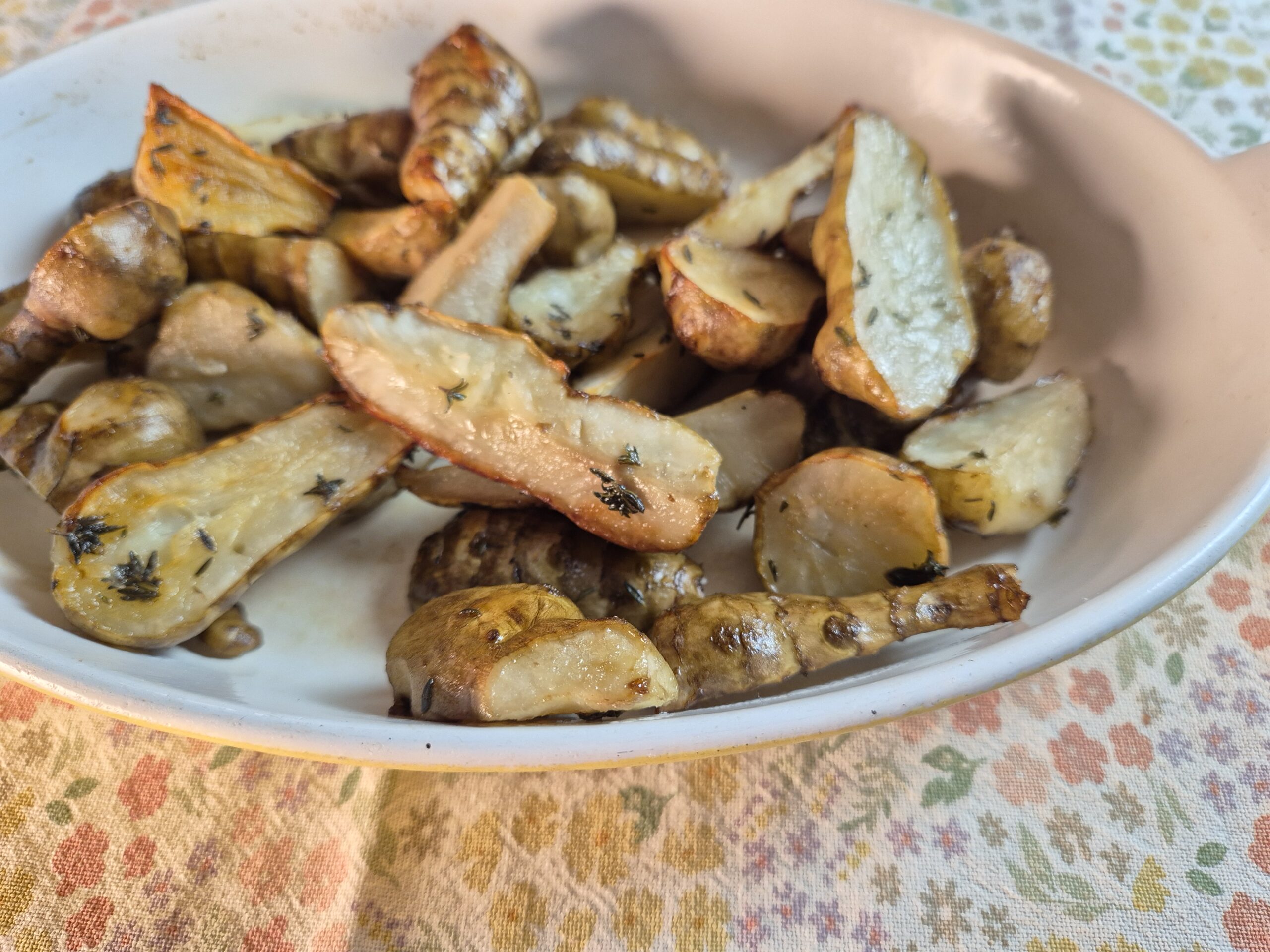 Zet de aardperen even in een bak water en verwarm de oven vast voor op 200°C. Boen de aardperen schoon (met een groenteborstel of schoon schuursponsje), snijd de snijvlakken en lelijke plekjes eraf (dat zijn er minder dan je denkt). Snijd de knolletjes doormidden of in kwarten en doe ze in een ovenschaal. Hussel ze om met een beetje olie en ris een beetje tijm van de takjes en strooi dat erover. Bestrooi met wat p&z en schuif in de oven. Na 10 min. schep je ze een keer om, na 20-25 min. zijn ze klaar om te eten.