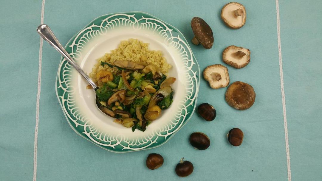 Eerst de kastanjes, dat kan je ook al van tevoren doen. Kerf in de platte onderkant van elke kastanje een kruisje in de schil en doe ze in een pan. Giet er koud water bij tot ze onderstaan, geef ze een snuf zout en breng het op hoog vuur aan de kook. Draai het vuur laag en laat de kastanjes 10 min. zachtjes koken. Draai het vuur uit en vis er telkens een stuk of 5 kastanjes uit en pel ze zo heet mogelijk. Als ze koud worden, gaat het bruine velletje weer vastplakken! Zet de kastanjes even apart en bereid de rest voor. Shiitake schoonwrijven met een keukenpapiertje en in plakjes snijden. Verwarm een scheutje olie in een ruime pan en bak de shiitake aan. Intussen kun je de uien pellen, halveren en in maantjes snijden. Shiitake uit de pan op een bordje apart zetten en weer een scheut olie in de pan. Bak de ui 10 min. tot ze zacht is en een beetje gaat kleuren. Andijviebladeren los van de struik snijden, wassen, kleiner snijden en toevoegen aan de uien. Andijvie al roerende in een paar minuten laten slinken. Kastanjes en shiitake toevoegen aan de andijvie. Op smaak brengen met p&z en misschien een scheutje tamari. Lekker met een gekookt graan.
