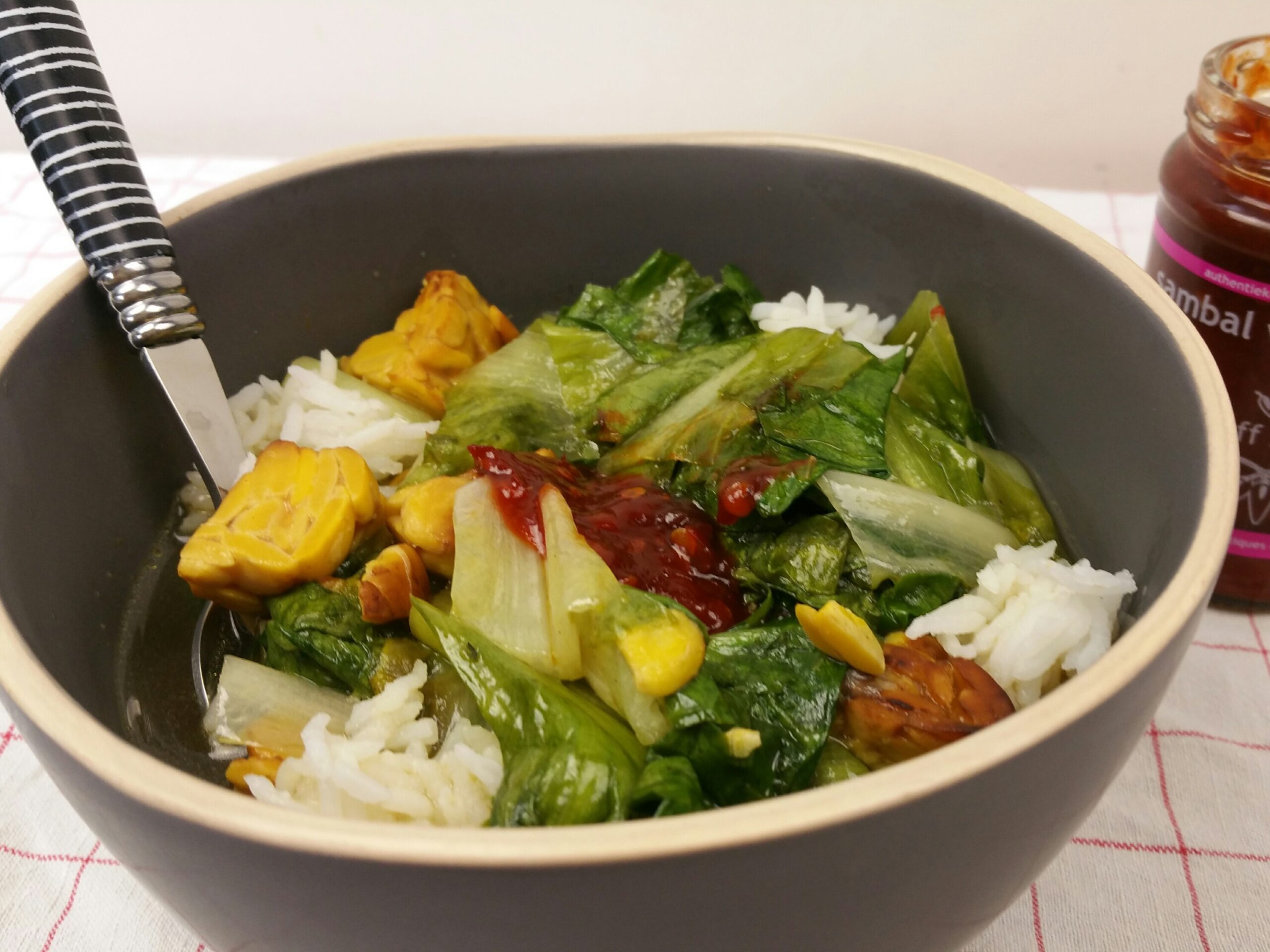 Was ondertussen de andijvie, haal de bladeren los en snij in grove repen. Als de soep kookt, voeg je een flinke scheut azijn, peper en nootmuskaat toe. Proef of je extra azijn wilt, jij bepaalt. Als de gehaktballetjes gaar zijn, voeg je de andijvie toe. Deze laat je kort meekoken, het moet knapperig blijven. Schep de rijst in een grote kom of diep bord, schep de soep eroverheen en voeg een schep sambal toe.