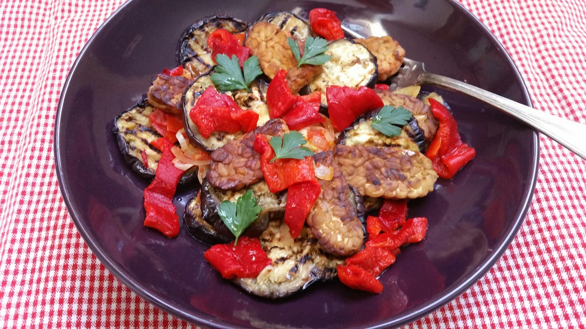 Schep het uien-tomaten mengsel in een schaal, verdeel de aubergine, paprika en tempé erover en bestrooi tot slot met een beetje fijngehakt korianderblad.