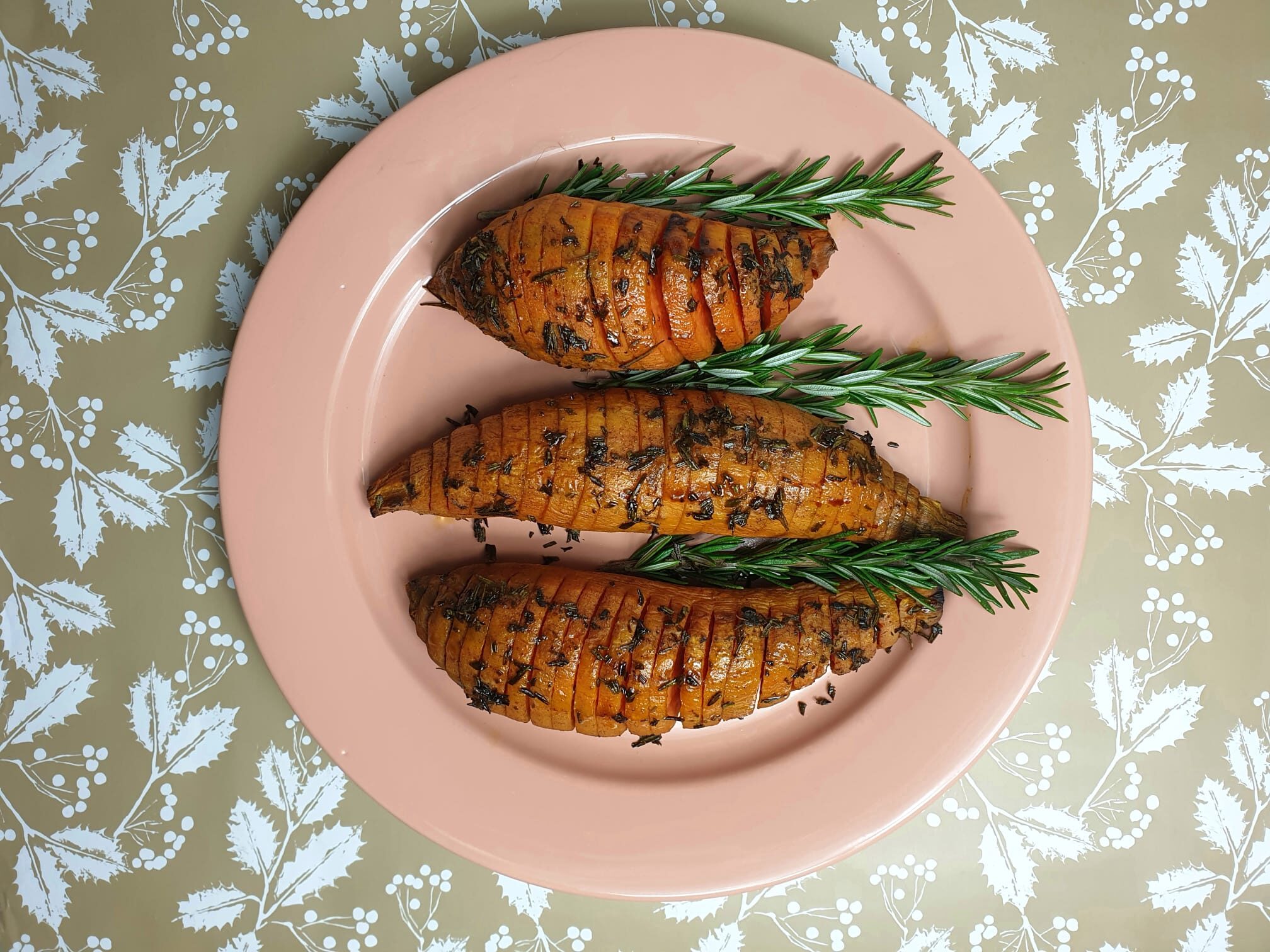Hasselback aardappels of -in dit geval- zoete aardappelen oftewel bataat, dat ziet er feestelijk uit en het is echt niet ingewikkeld om te maken. Er is namelijk een truc en die verklap ik graag! Je kan deze aardappelen ook al een dag tevoren maken en dan op 75 graden langzaam opwarmen op de dag dat je gaat eten. Bestrijk ze met wat olie en vers gehakte kruiden en ze zien er prima uit! Lekker bijgerecht bij bijvoorbeeld de gegrilde rode kool van de receptenpagina uit je tas, deze week.