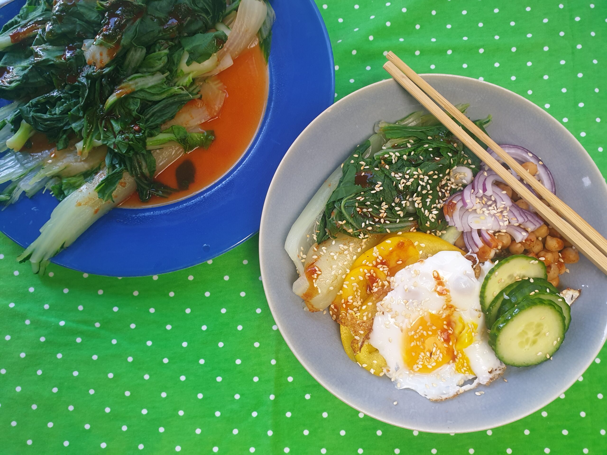 Was de rijst en zet op en kook gaar volgens aanwijzingen op het pak. Breng ook vast een pan water aan de kook om straks de paksoi te blancheren. Was alle groenten. Haal het groen van de stelen paksoi en snijd het groen in grove repen. Pel ui en knoflook en snijd de ui in dunne (halve) ringetjes. Snijd de andere groenten in fijne, makkelijk eetbare reepjes of stukjes. Laat de kikkererwten of bonen uitlekken in een zeef. Maak de saus door alle ingrediënten te mengen. Verwarm een ruime koekenpan en rooster het sesamzaad tot het nét een beetje kleurt, zet dan even apart in een kommetje. Verwarm een beetje olie in de pan en bak de kikkererwten droog. Bestrooi met wat gerookt paprikapoeder, komijn en zout. Haal uit de pan en zet even apart. Voeg een tl zout toe aan de pan met kokend water en blancheer de witte delen van de paksoi tot je ze zacht genoeg vindt (4-5 min.). Verwarm opnieuw wat olie in de koekenpan en bak 4 spiegeleieren. Haal de paksoi uit de pan en laat uitlekken in een vergiet, blancheer dan het groen. Laat dat een paar minuten blancheren en ook uitlekken. Leg de stelen op een bord en druppel er een klein beetje van de saus over, daarna leg je het groen er op en doe je er weer een paar druppels saus over.