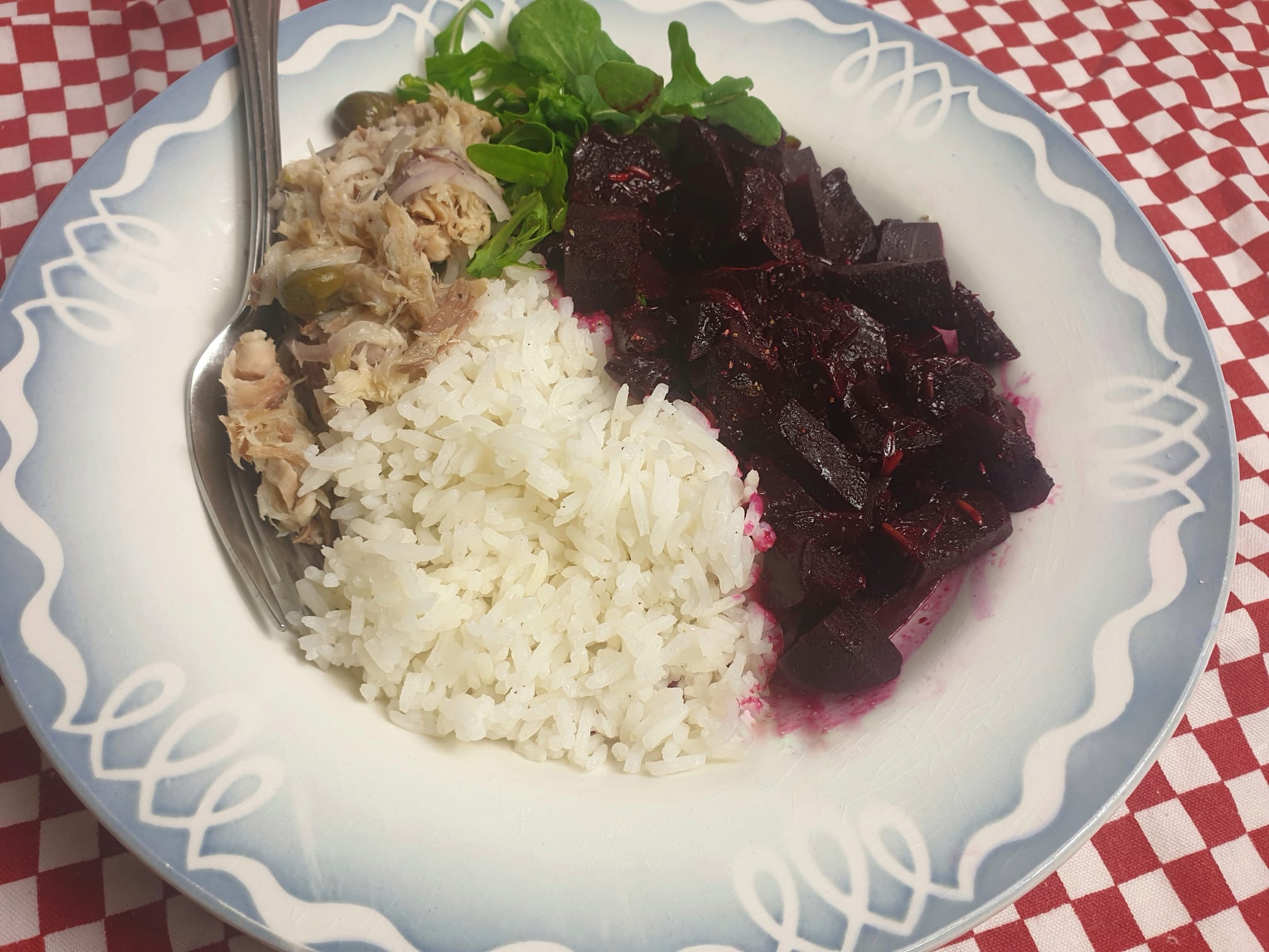 De bijzonder twist komt van het sinaasappelsap en – als je durft- een beetje rasp, maar pas op, dit is echt een heel sterke smaakmaker! Wij aten het met rijst, rucola en gerookte makreel, waar ik een uitje en wat kappertjes doorroerde: een prima combinatie. Gekookte aardappelen en een pittig (vega-) worstje of een linzengerecht zouden ook prima gaan.