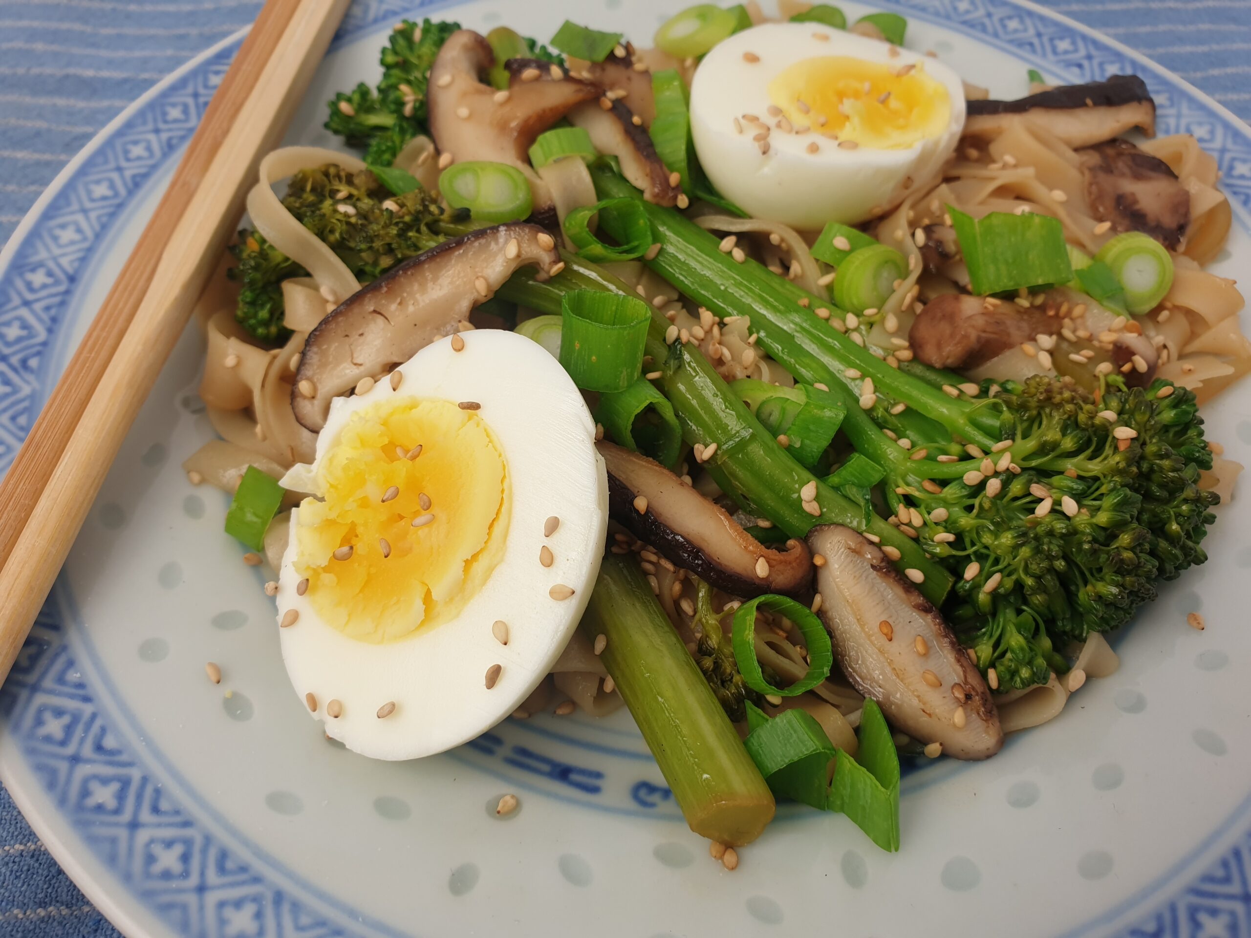 Bereid de noedels volgens de gebruiksaanwijzing, spoel ze koud af en laat goed uitlekken in een vergiet. Kook de eieren zoals je ze lekker vindt, hard of halfhard… schrik ze onder de koude kraan en pel ze. Rooster in een klein koekenpannetje de sesamzaadjes tot ze wat kleuren en laat dan afkoelen op een bordje. Veeg de champignons schoon en snijd in plakjes. Pel ui en knoflook, snijd ui in partjes en hak de knoflook fijn. Was de bimi en bosui. Als de bimi erg lang is, kun je de steeltjes een stukje afsnijden, maar snijd het gewoon klein en eet het mee, het is allemaal eetbaar. Verwarm de olie in een wokpan en fruit ui en knoflook tot de ui glazig ziet. Voeg de ketjap, gembersiroop en citroensap toe, 200 ml water en de bimi. Kook de bimi beetgaar en snijd intussen de bosui fijn. Roer de noodles ook door de bimi en warm even door. Voeg de sesamolie toe en proef even! Strooi op het bord de bosui en sesamzaadjes er over en leg op elk bord één of twee ei-helften.