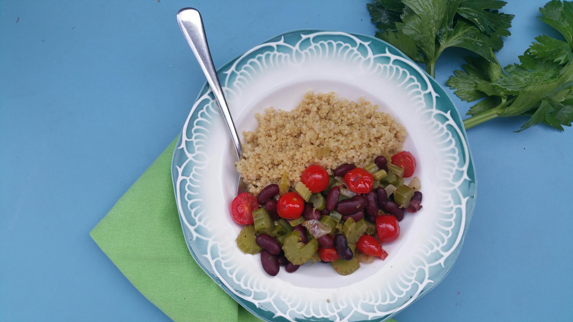 Verhit de olie en fruit de ui glazig. Voeg knoflook, oregano en bleekselderij toe en strooi er een beetje zout op. Bak een paar min. en blus met een ½ kopje witte wijn of water en voeg de suiker toe. Stoof met een deksel op de pan tot je het gaar genoeg vindt, ongeveer 10 min. Roer halverwege een keer. Snijd ondertussen de tomaatjes doormidden en laat de bonen uitlekken in een vergiet. Hak eventueel wat peterselie fijn. Warm bonen en tomaten nog een paar min. mee Strooi er wat peper over en eventueel wat gehakte peterselie. Serveer met de quinoa.