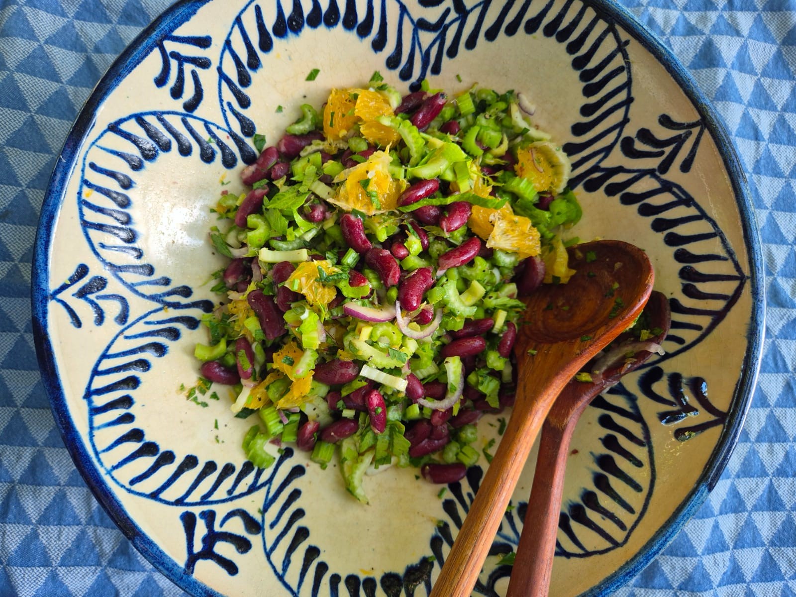 Eerder maakte ik al eens een salade met rozemarijn en sinaasappel in combinatie met venkel, nu heb ik uitgeprobeerd of dat ook met bleekselderij kan. Het resultaat is totaal anders, ik vond het lekker fris en knapperig! Als je naar een potluck feestje gaat kun je ook gerust de hoeveelheid bonen verhogen, bijvoorbeeld met een mix van witte bonen en reuzebonen, dat geeft een leuk effect.