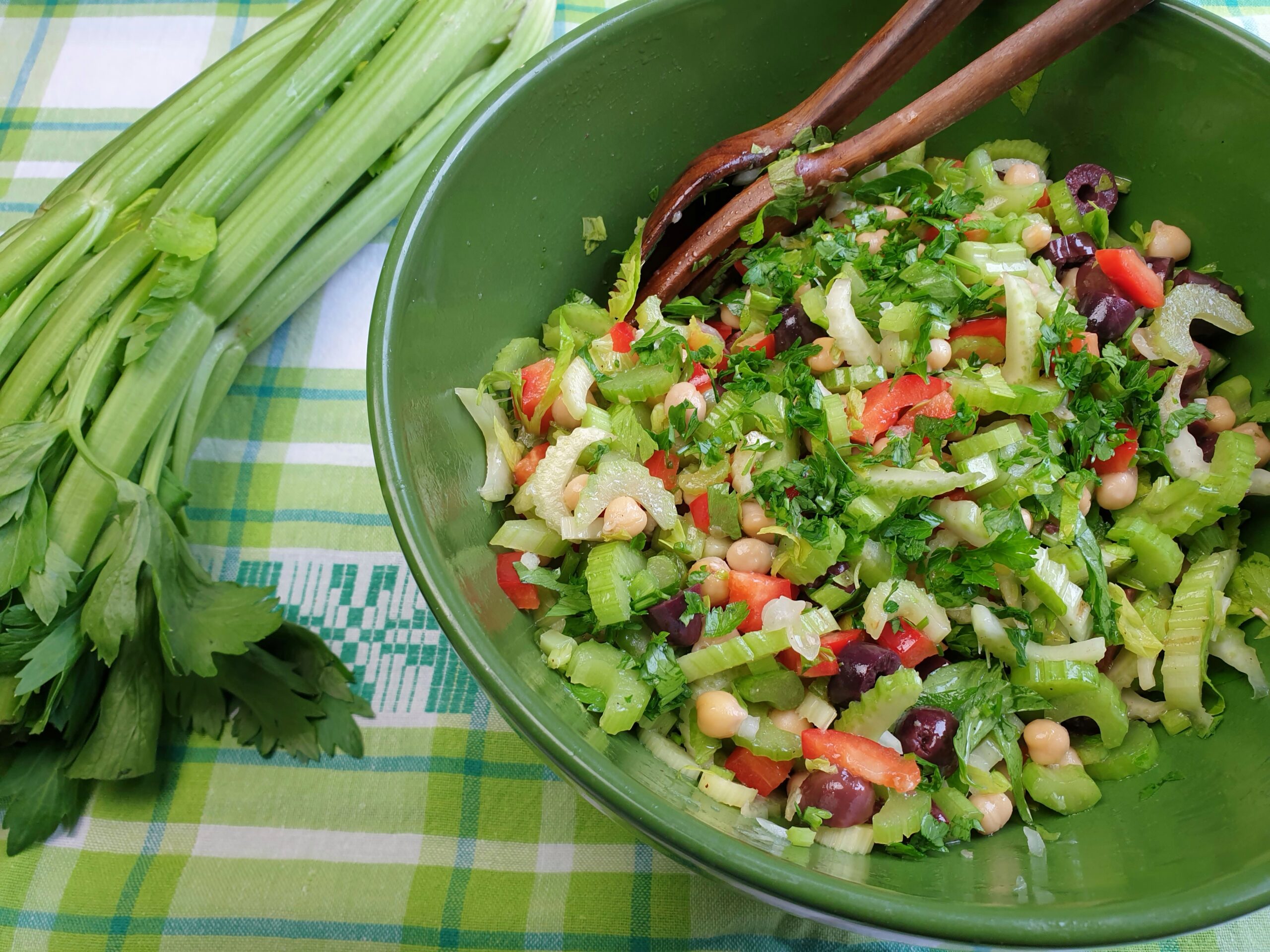 Bleekselderij is ook als salade erg lekker, het knapperige vormt een mooie combi met het zachte van de kikkererwten. De kern van een struikje smaakt vaak het sterkst, bewaar dat misschien beter voor een soepje of stoofgerecht.