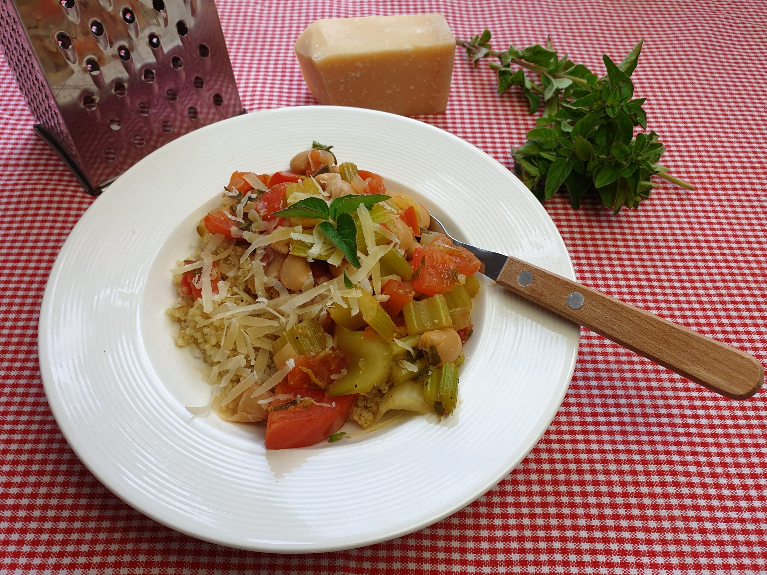 Bleekselderij, altijd lekker door de pastasaus, in een soepje of een paar stengels rauw om weg te knagen, maar ook als echt groente gerecht heel smakelijk. Met tomaat is het een goed combinatie. Ik gebruikte verse oregano uit de tuin, maar gedroogde kan natuurlijk ook. Lekker met rijst of quinoa en een beetje geraspte kaas op je bord.