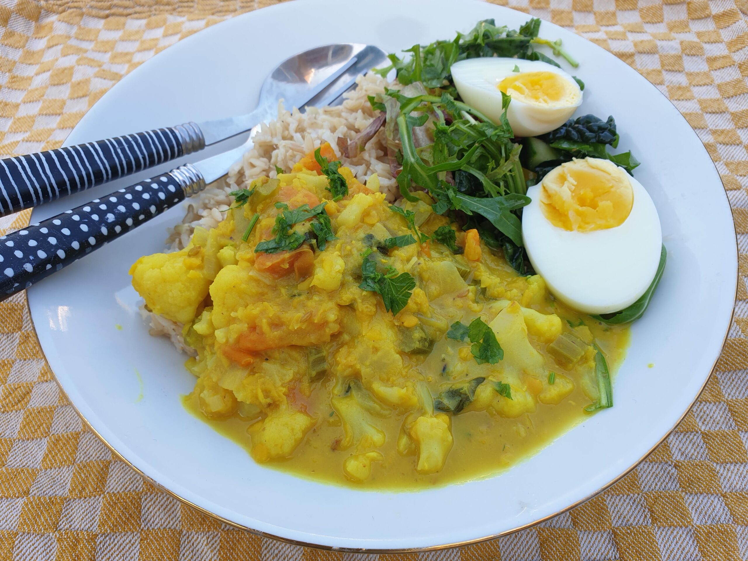 Bereid eerst alle groente voor. Pel ui en knoflook, snipper beide. Was alle andere groente en snijd in stukjes, de bloemkool niet te klein, de stronk kan ook mee in plakjes! Verwarm olie in een ruime pan met dikke bodem en fruit de ui glazig. Voeg dan wortel en bleekselderij toe en voeg de kruiden toe. Stoof een paar minuten en druk het bouillonblokje stuk op de bodem van de pan. Voeg de kokosmelk, linzen en 1 blik water toe, controleer altijd even de linzen op steentjes, je hoeft ze niet te wassen of weken. Breng aan de kook en voeg na 5 minuten ook de bloemkool toe. Laat met deksel op de pan op zacht vuur in 15 min. gaar worden, roer af en toe en voeg zo nodig nog meer water toe. Proef op het eind voor p&z, liefhebbers voegen wat sambal toe.