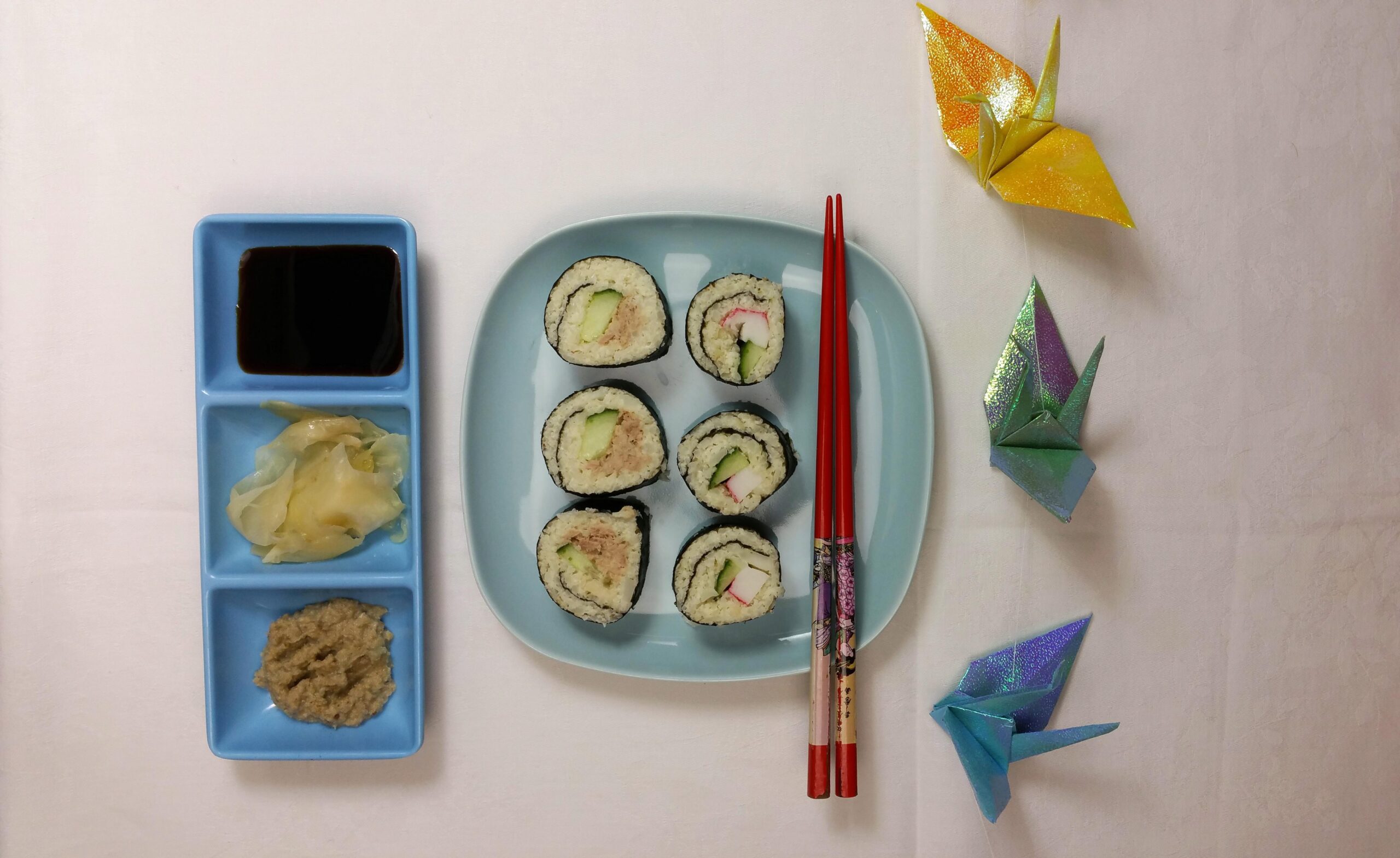 Bloemkool laat zich leuk raspen en kun je dan gebruiken in plaats van rijst of couscous, je kunt er pizzabodems mee maken, maar dus ook deze leuke sushi! Mijn kinderen zijn dol op sushi en ik geef het wel eens mee naar school als lunch, daar worden ze heel blij van. Deze bloemkoolsushi viel ook zeer in de smaak, Rosa had eerst niet eens door dat ze bloemkool at in plaats van rijst. De mooie kraanvogels op de foto zijn gevouwen door Meike, ik vond ze helemaal passen in dit Japanse plaatje, vandaar.