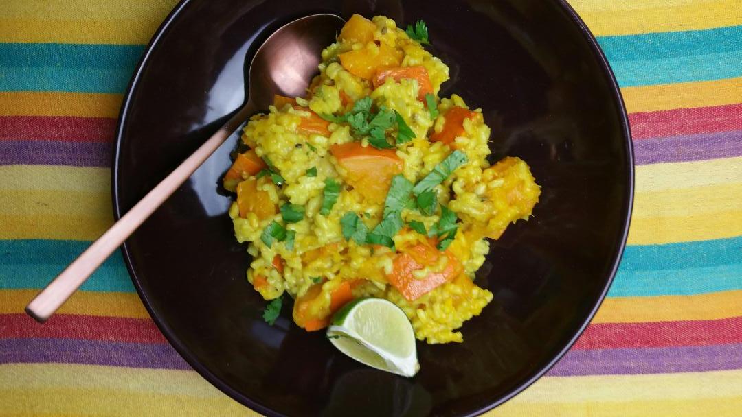 Dat is weer eens wat anders, een risotto met pompoen en heel veel kruiden. Ben je een beetje huiverig voor de kruiden, dan neem je gewoon wat minder. De kardemom is sterk van smaak, je kunt ook de zaadjes in hun pitjes laten en ze op je bord eruit vissen, want oei, als je er op kauwt is het niet zo fijn. Lekker kruidig troostvoer, het lijkt wel een zon op je bord!