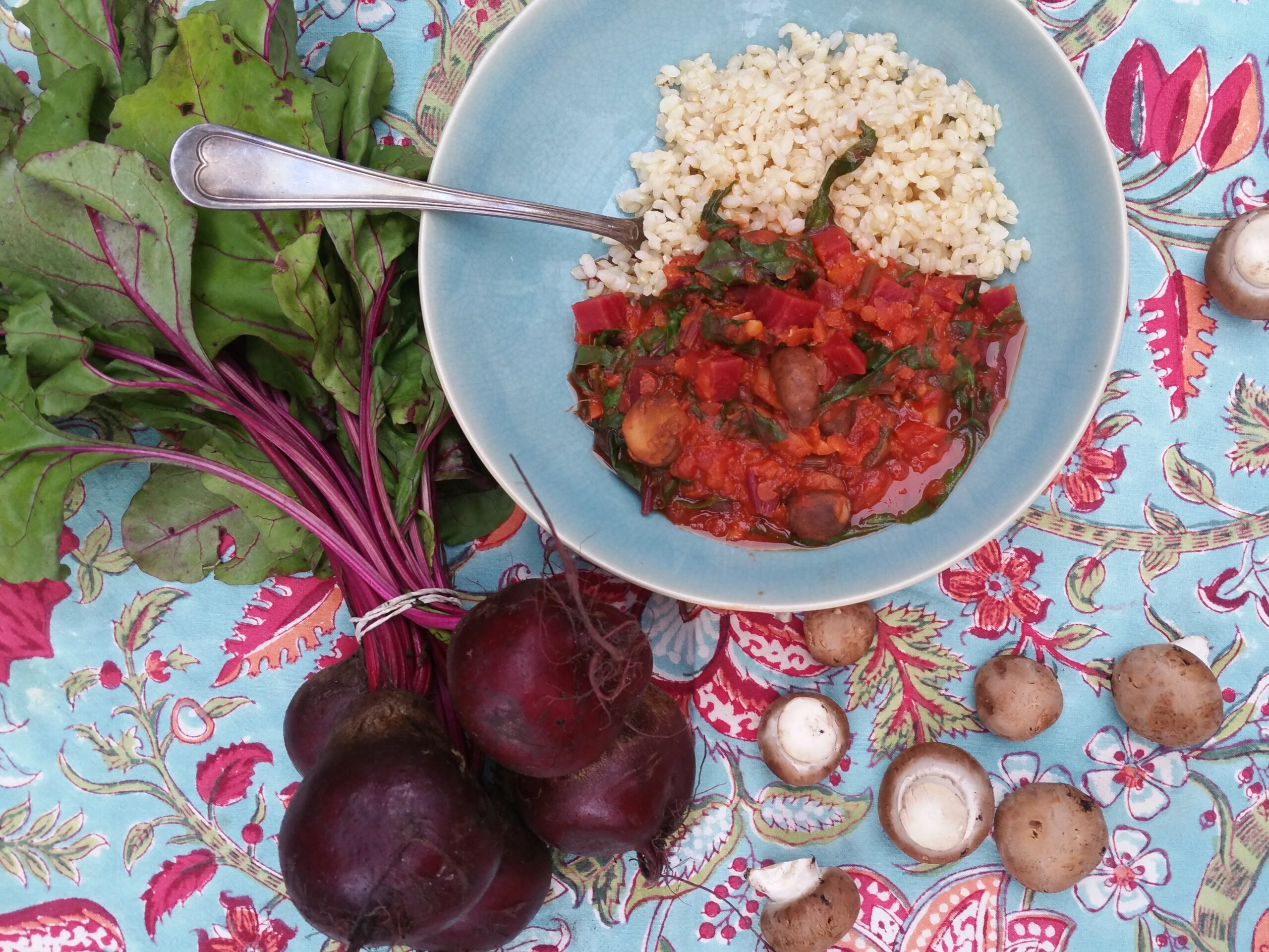 Bosbieten en champignons samen, zou dat kunnen?  Ik vond verschillende gerechten met een dergelijke combinatie en probeerde deze curry.  Ook al lijkt de combinatie misschien wat gek, maar ik probeer graag nieuwe dingen uit! Heel lekker met volle rijst. Voor mensen die niet zo van het zoete van bieten houden is het gerecht misschien aan de zoete kant, dan zou ik eerder een lekkere bietensalade maken, ook heel lekker.