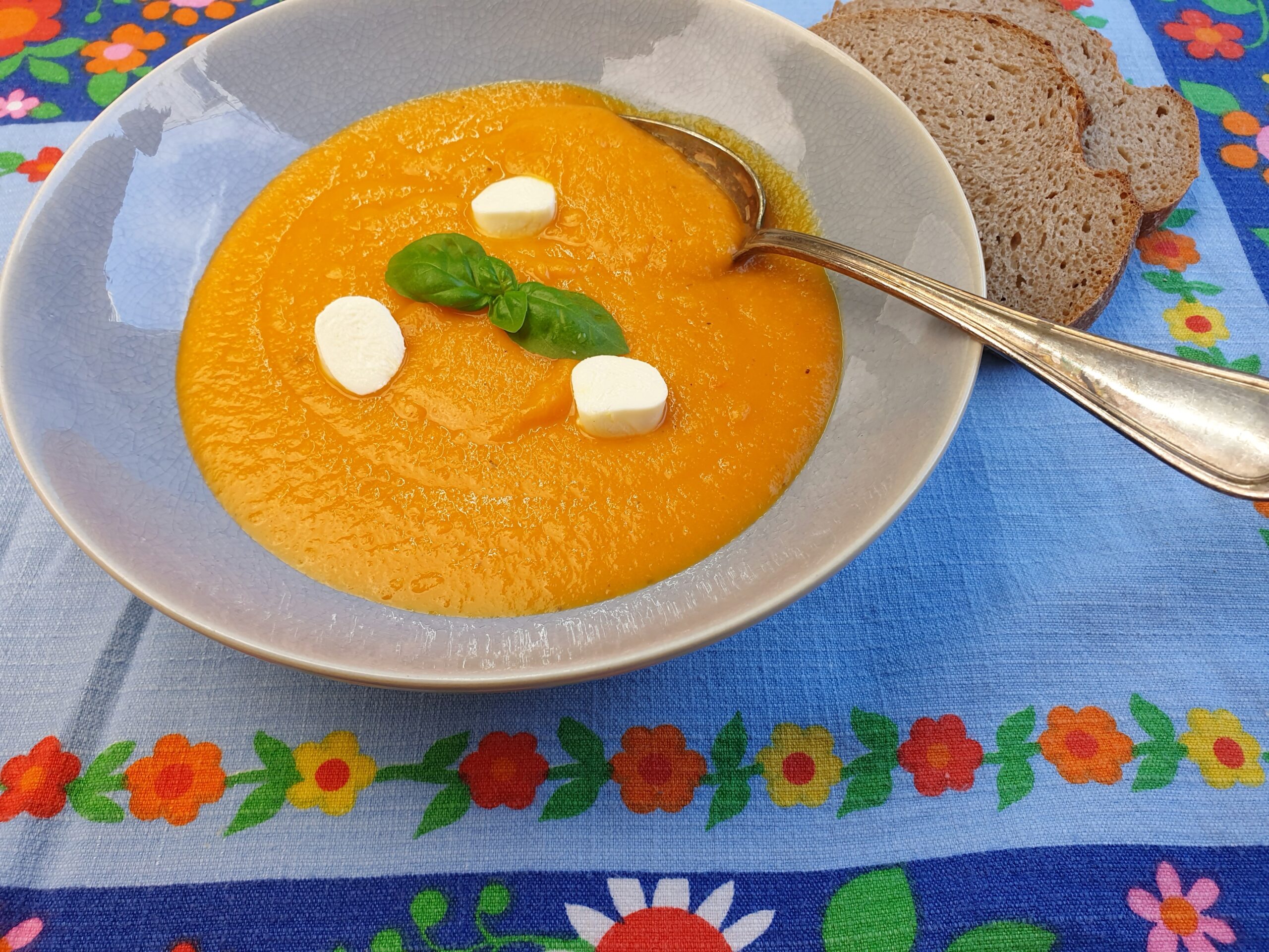 Ooit, ergens in een Frans restaurantje, aten we deze koude wortelsoep. Sindsdien zit hij in mijn geheugen, hij is heel speciaal en toch makkelijk te maken, precies waar ik van houd. Mocht het weer omslaan, warm smaakt hij ook!