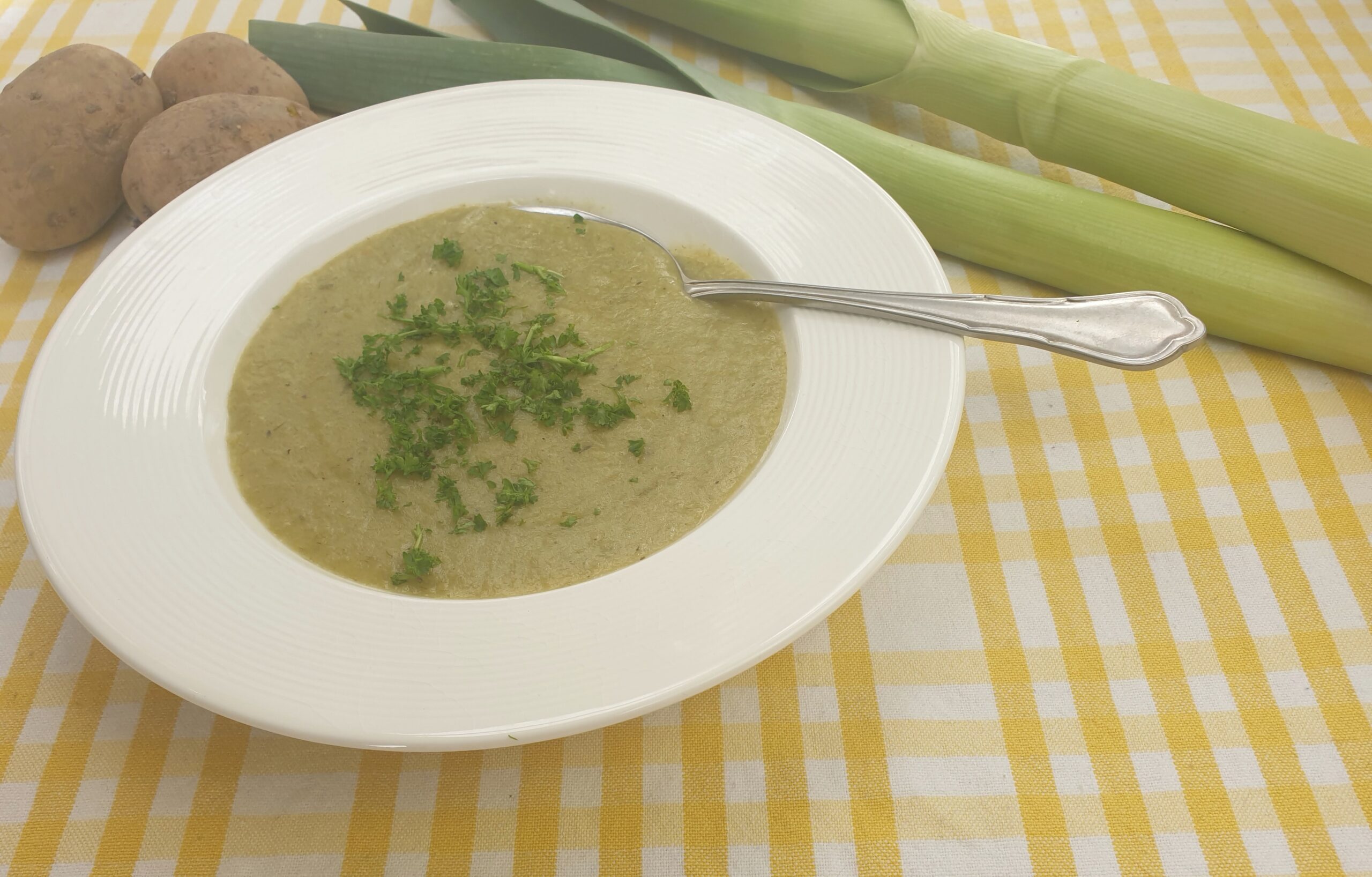 500-700 g prei, 500 g aardappels, 3 tenen knoflook, 3 el boter (olie kan ook), ½ l bouillon (kip- rund of groente), 2 laurierblaadjes, 3 takjes verse tijm (of 1½ tl gedroogde), 250 ml melk, p&z, optioneel room voor het serveren, bieslook of peterselie ter garnering