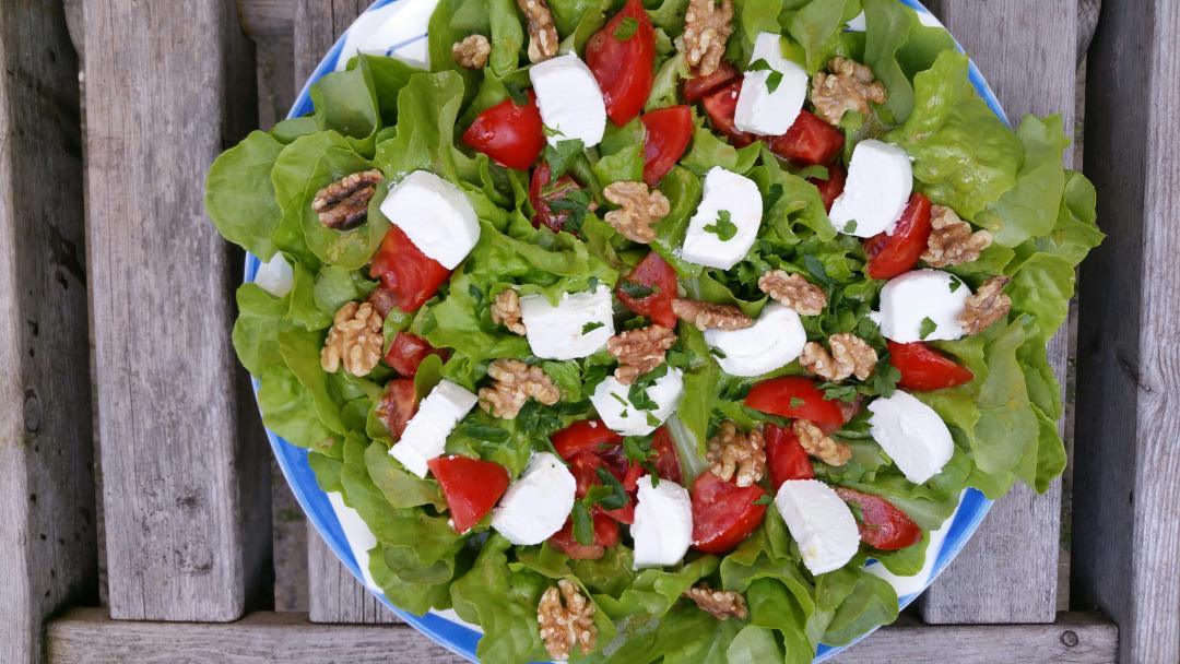 O lala, wat waren wij blij met de eerste sla uit eigen tuin! Na al het harde werken is het echt heel erg genieten om sla van eigen teelt te eten. Goede sla heeft niet zoveel nodig, dat weten ze in Frankrijk heel goed. Met een goede dressing, wat tomaten, kaas en – kom doe eens luxe – een hand vol noten, tover je in een mum van tijd een prachtige salade te voorschijn. Laat de zon maar schijnen! En wil je er een wijntje bij?