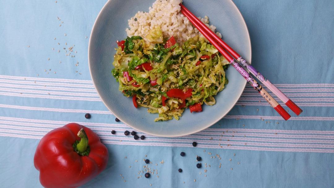 Snijd intussen de gember heel fijn en was de paprika, snijd steel en zaadlijsten weg en snijd in mooie reepjes. Voeg de gember, paprika, honing en een scheutje zoute sojasaus toe en bak nog een paar min. Het is lekker als de kool nog een beetje knapperig is. Strooi tot slot de sesamzaadjes er over.