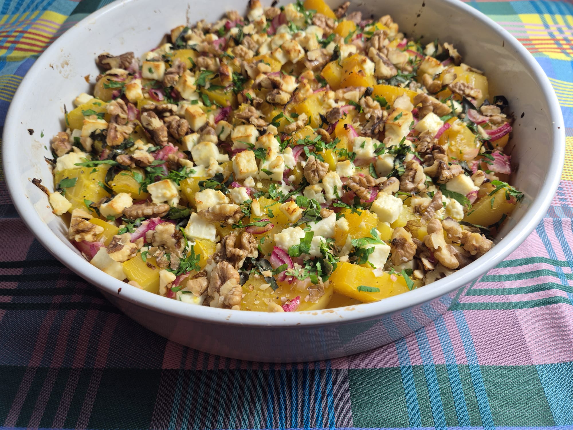 Spoel de bieten af en zet ze op in een pan met ruim koud water. Kook ze gaar, hoe lang dit duurt hangt af van hoe dik de bieten zijn. Ik had 2 hele grote knoeperts en die waren na een uur klaar, kleinere zijn eerder klaar. Een beetje stevigheid is fijn, je kan een keertje prikken met een scherp mes om te kijken of ze goed zijn. Pel de ui en snijd doormidden en dan in halve boogjes. Doe ze in een kommetje en giet er het citroensap over en laat even staan. Rooster de walnoten in een droge koekenpan tot ze wat kleuren, laat afkoelen en hak grof. Snijd de feta in kleine blokjes. Snipper een beetje peterselie. Giet de bieten af en laat ze schrikken onder de koude kraan. Nu kan je heel makkelijk de velletjes er af wrijven. Je kan de bieten laten afkoelen en ze koud of lauwwarm als salade eten, je kan ze ook warm eten. Ik maakte ze voor een etentje en warmde ze op in de oven. Hoe dan ook: Snijd de bieten in partjes of plakjes en doe ze in een ruime schaal. Sprenkel er wat olijfolie over en geef wat p&z. Verdeel de uien er voer, de feta en walnoten en als je het als salade eet sprenkel je ook het uien-citroensap erover. Warm desgewenst even op in de oven (180°C, 20 min) en bestrooi voor het serveren met een beetje fijn gehakte peterselie.