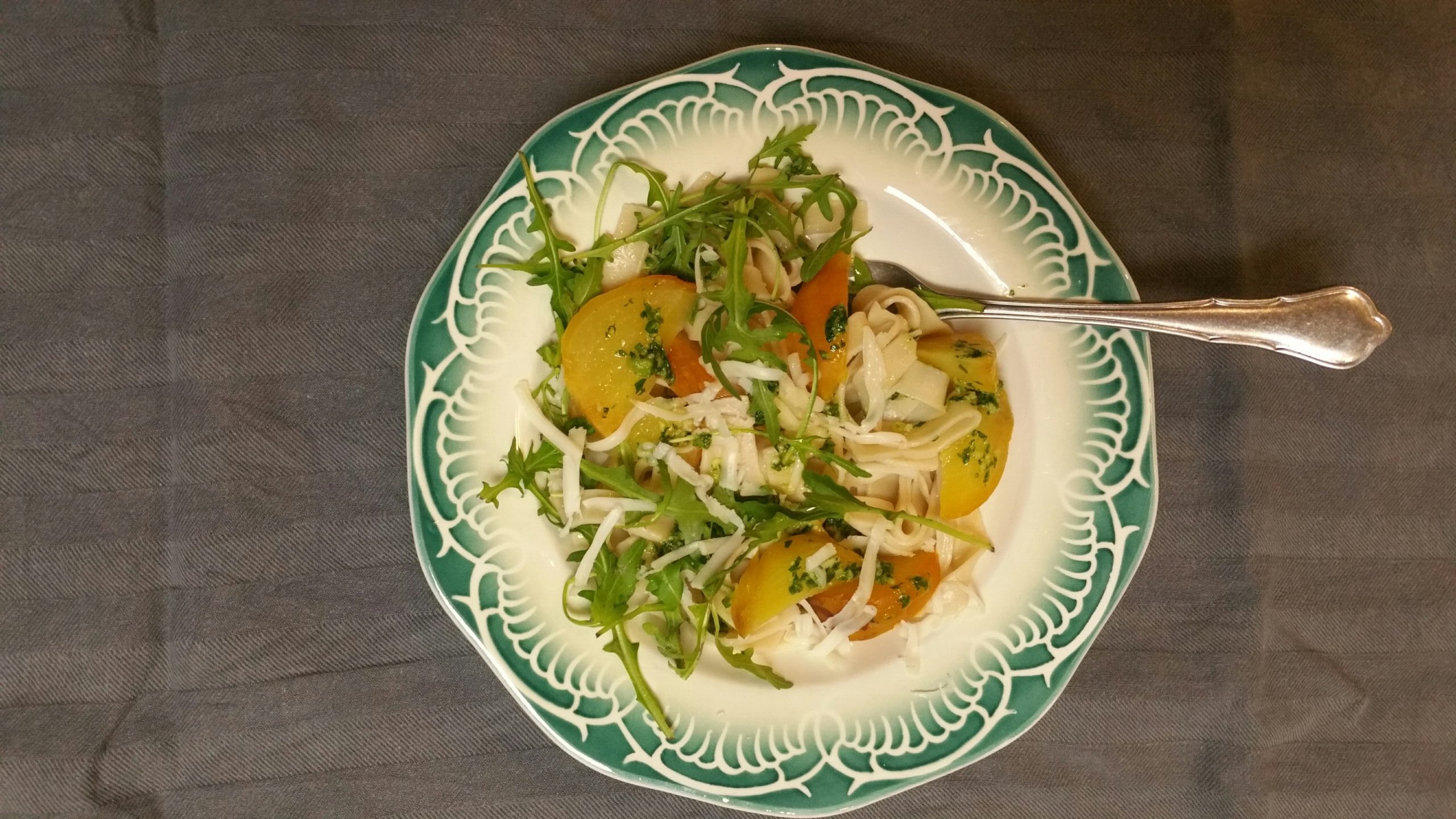 Gele bieten zijn wat minder uitgesproken van smaak dan de rode variant. Heerlijk in dit vrolijke pastagerecht! Een super simpel gerecht, maar met vers gemaakte pesto en een goede kwaliteit pasta echt superlekker!
