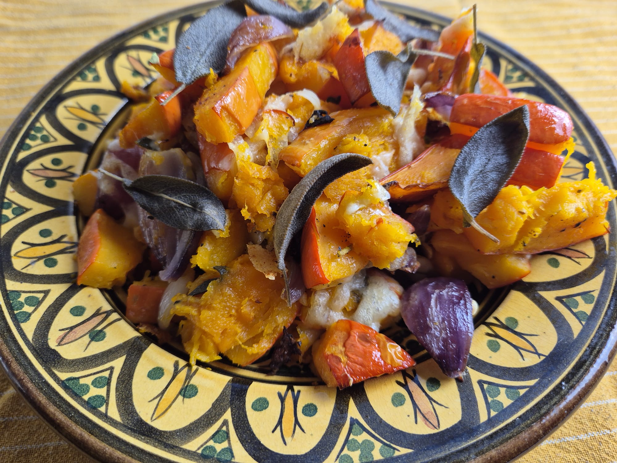 Verwarm de oven voor op 200ºC. Boen de pompoen schoon, snijd steel en onderkant bij, verwijder lelijke plekjes van de schil. Halveer de pompoen, lepel de pitten er uit en snijd in stukjes, misschien heb je aan een halve pompoen al genoeg. Pel de uien en snijd in parten. Hussel pompoen en ui op de bakplaat om met wat olijfolie. Vet 8 salieblaadjes in met olie en leg ze op de bakplaat in een hoekje. Snijd de andere blaadjes fijn en strooi over de pompoen. Geef wat p&z en bak 15 min. in de hete oven. Haal dan vast de hele salieblaadjes van de bakplaat en leg ze even op een keukenpapiertje. Keer de pompoen, bestrooi met de kaas en bak nog 10 min. in de oven. Serveer met de krokante salieblaadjes.