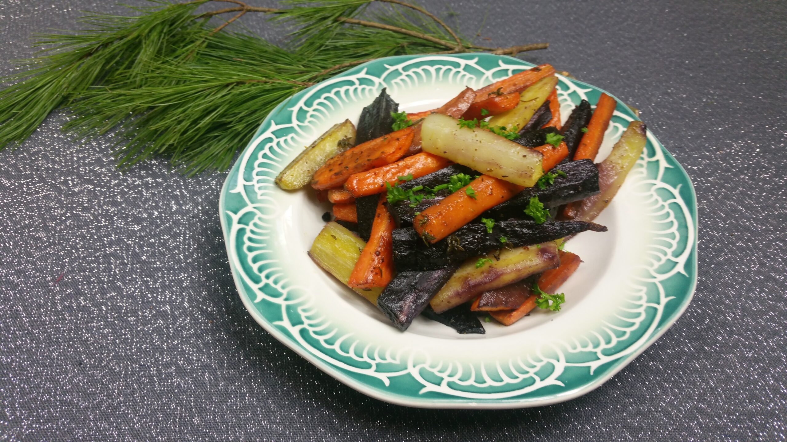 Groente uit de oven, dat is altijd een slimme zet wanneer je een diner voor gasten houdt. Je schuift ze de oven in en hoeft ze alleen tussendoor nog maar een keer om te husselen, de oven doet het werk. Bovendien is bakken in de oven een goede manier om het mooie van die gekleurde wortels te behouden, want als je de paarse wortel met de oranje meekookt, wordt het een grauwe boel. Ze smaken heel goed met een schep romige yoghurt en bijvoorbeeld rijst of couscous. Prima bijgerecht bij je kerstmaal!