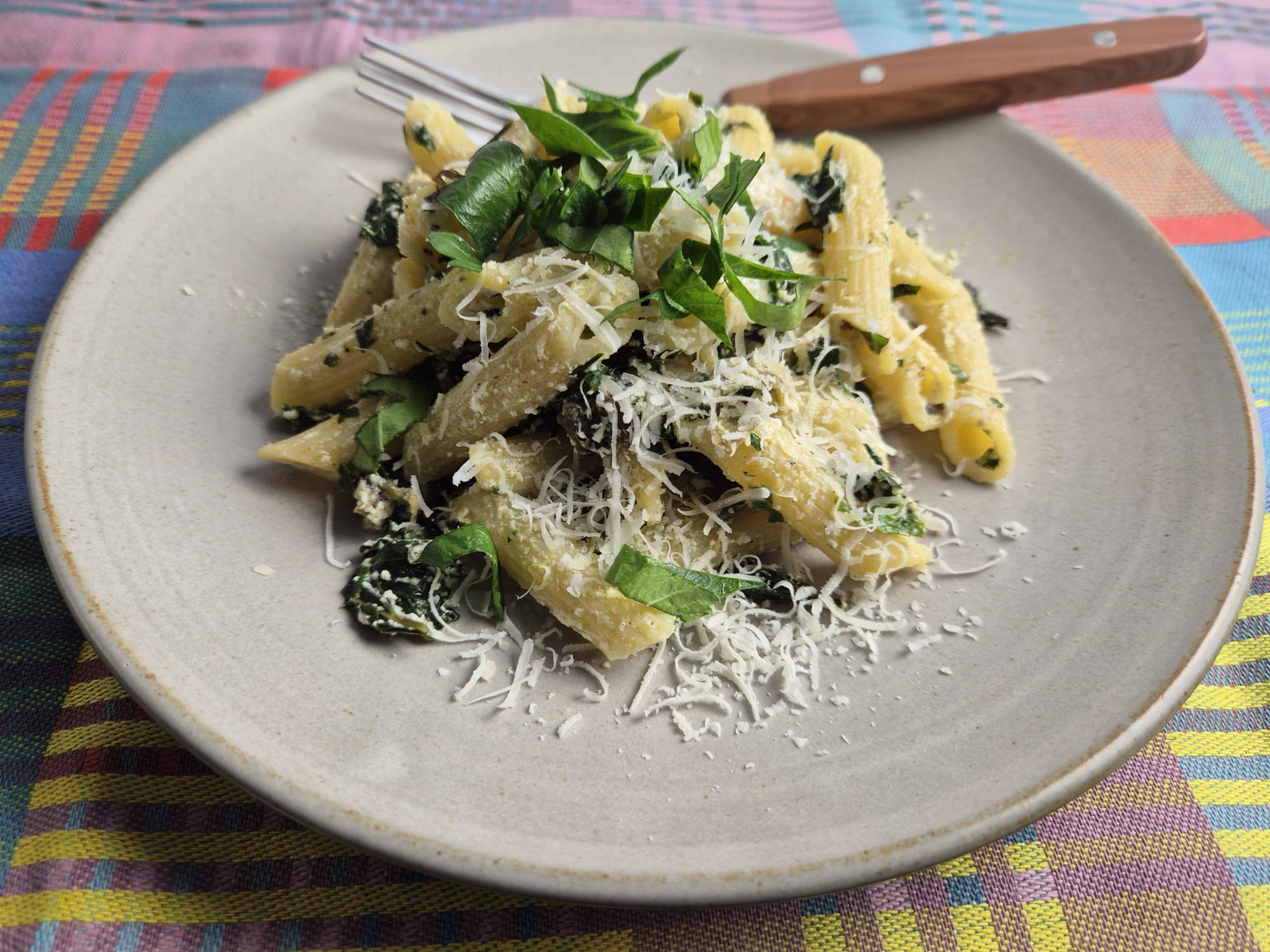 Van een klant kreeg ik de leuke tip om ook het blad van de bleekselderij te gebruiken, je kan het stoven tot een bijgerechtje. Vrij sterk van smaak, maar smakelijk! Ik maakte er een pasta gerecht van, maar het is ook lekker als klein bijgerecht bij bijvoorbeeld een linzen-of bonengerecht, bij vis of vlees.