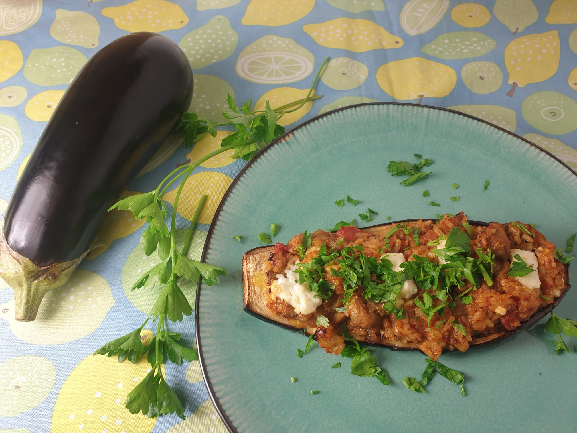 Aubergine vind ik het lekkerst als ie in de oven gebakken wordt. Gevuld is het helemaal een feestje en eigenlijk is dat helemaal niet zo moeilijk. Perfect om een restje rijst te verwerken!