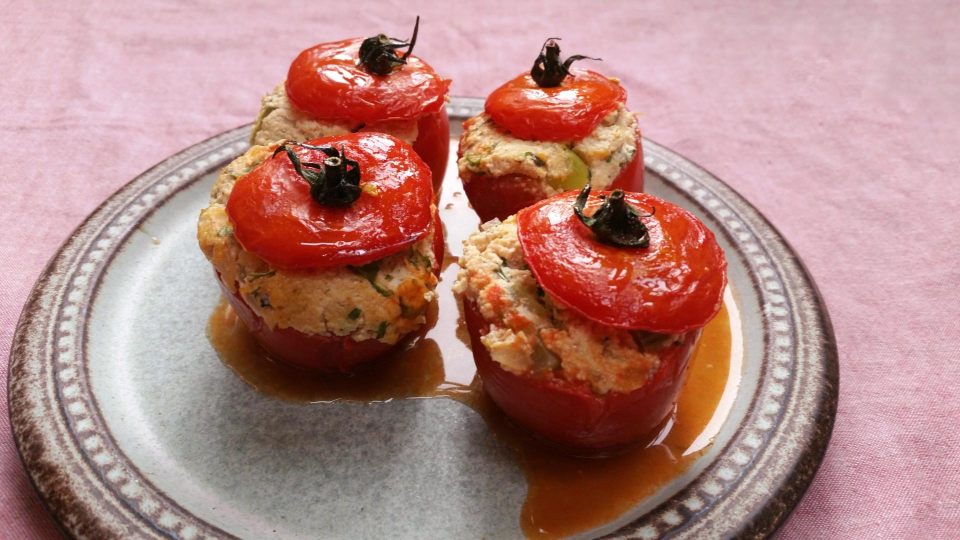 Terwijl in de tomaten stond op te binden, stond ik ook na te denken over lekkere gerechten voor de zomer. Eén van de dingen waar ik dol op ben, is gevulde groente, vooral tomaten en paprika’s. Nu is dat heerlijk met gehakt, vooral lamsgehakt lust ik graag, maar natuurlijk is het ook leuk om een vegetarische variant te verzinnen. Nou, met een pakje tofu is dat natuurlijk helemaal niet zo moeilijk! Het recept heb ik geschreven voor 4 tomaten, maar zelf maakte ik er meer en gebruikte een heel blok tofu. Misschien houd je dus wat vulling over. Gebruik het gerust om andere groente te vullen, zoals courgettes, of paprika. En het is ook lekker op een boterham!