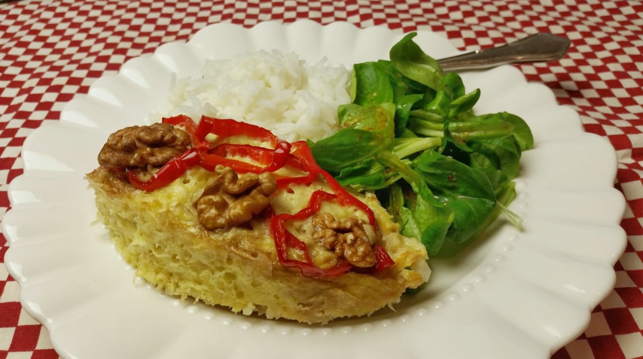 1 kleine knolselderij, 100 g blauwschimmelkaas, 4 eieren, 200 ml room, handje walnoten, eventueel 1 ramiropaprika, p&z