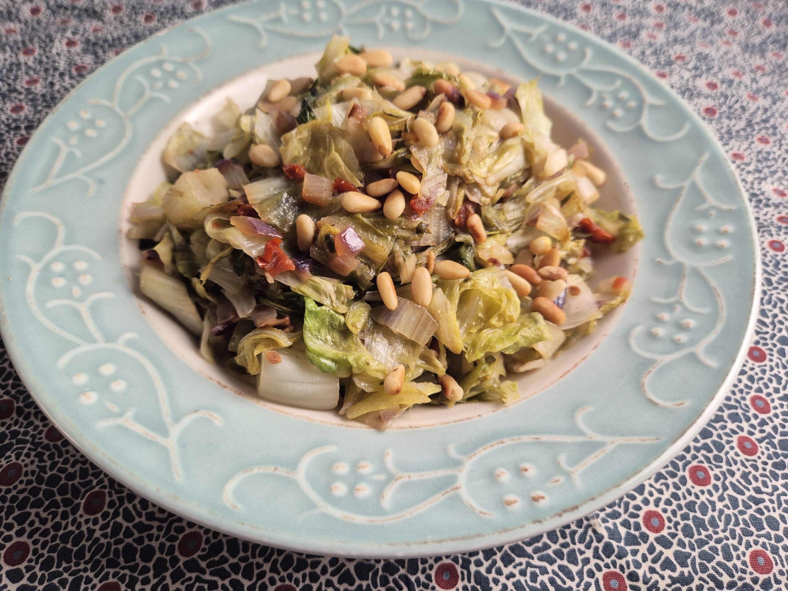 Pel de ui en snipper deze. Verwarm een scheutje olie in een ruime pan en fruit de ui glazig. Ris ede naaldjes van een takje rozemarijn en hak fijn, voeg toe aan de pan. Spoel de groenlof onder de kraan en halveer, snij een eventuele kern er uit en snijd dan in niet te kleine stukjes. Voeg toe aan de pan. Snijd de zongedroogde tomaat in kleine stukjes en voeg ook toe. Rooster in een droge koekenpan de pijnboompitjes tot ze wat kleuren. Bak de groenlof tot je het gaar genoeg vindt, voeg balsamicoazijn toe en geef wat peper. Bestrooi met de pitjes en serveer.