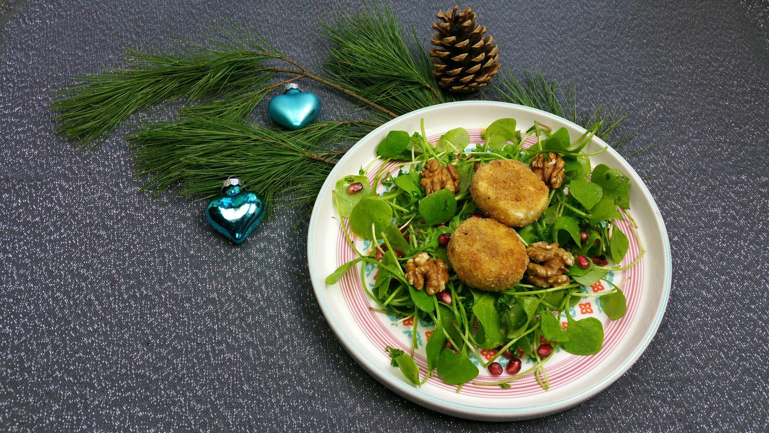 Kerstsalade met gebakken geitenkaasjes en granaatappel