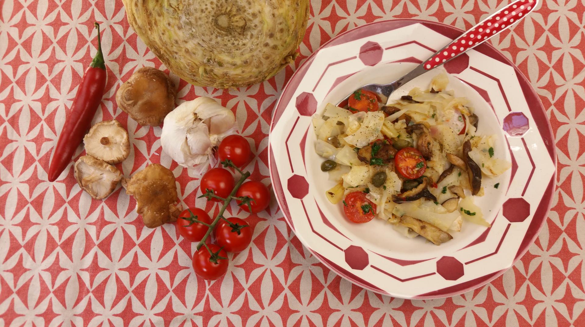 1 knolselderij, 1 zakje oesterzwammen, 150 g kerstomaatjes, 4 tenen knoflook, 1 rode peper, handje peterselie, 1 el kappertjes, goede olijfolie, p&z