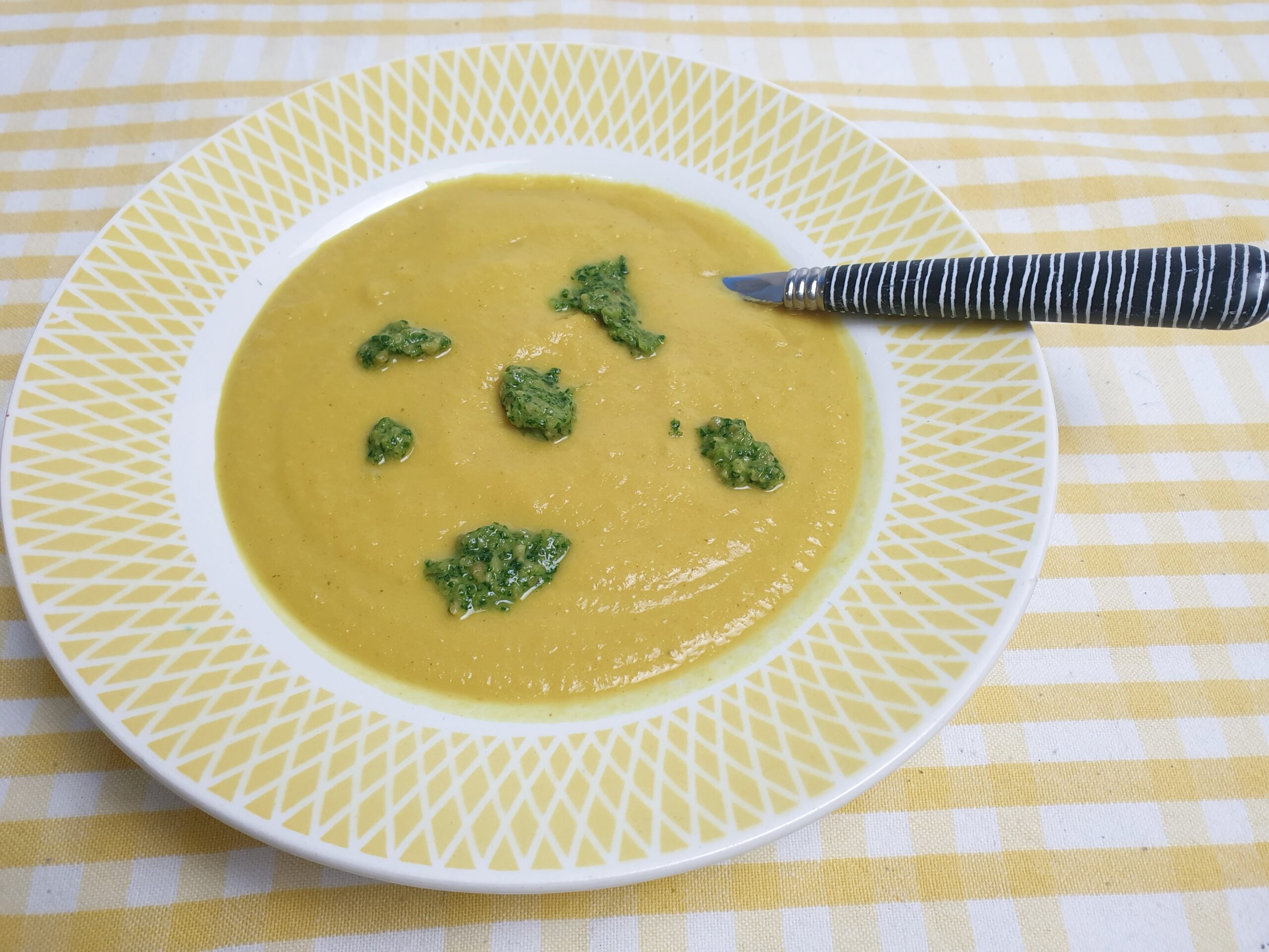 Pel ui en knoflooktenen. Snipper de ui en vast 1 teen knoflook. Snijd de knolselderij in plakken en schil ze dan en snijd in blokjes. Schil de aardappel en snijd ook in blokjes. Verwarm een schut olie in een soeppan. Fruit de ui en 1 teen knoflook zacht in de pan en voeg dan de knolselderij en aardappelblokjes toe en bak even mee. Voeg het bouillonblokje, kurkuma en gemberpoeder toe en voeg dan 600 ml heet water toe. Breng aan de kook en kook 15 min. met een deksel op de pan. In die tijd maak je de pesto. Haal het blad van de radijsjes (die gaan in de sla of op brood) en was het loof, verwijder lelijke blaadjes. Doe ze in het bakje van de staafmixer en snipper er het teentje knoflook bij. Voeg de pinda’s, olijfolie, sesamolie en een kneepje citroensap toe en draai tot een mooie pesto, eventueel voeg je nog wat meer olie of een scheutje water toe als je hem wat dunner wilt. Voeg de kokosmelk toe aan de soep en laat even koken. Pureer in de blender of met een staafmixer en proef voor p&z. Serveer de soep met een paar klodders pesto en eet er een lekker vers (af-)gebakken brood bij.