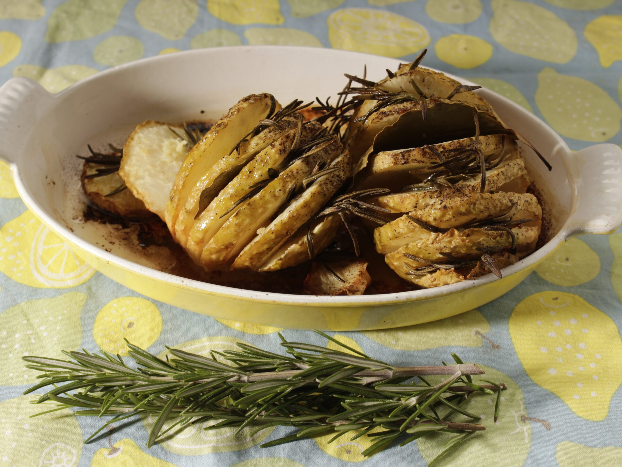 Knolselderij is misschien een groente die je enkel gebruikt als je erwtensoep of linzensoep maakt, maar ook als echte volwaardige groente kan hij prima meedoen. Zeker als je hem langzaam laat garen in de koekenpan of oven, wordt de smaak superlekker! Lekker met gesmolten kaas er op of een peper-roomsaus, door de aardappelpuree of in blokjes gebakken door een salade. Deze week combineerde ik hem met rozemarijn en bakte hem in de oven: de moeite waard! Lekker met stoofvlees of een linzenstof en rijst.
