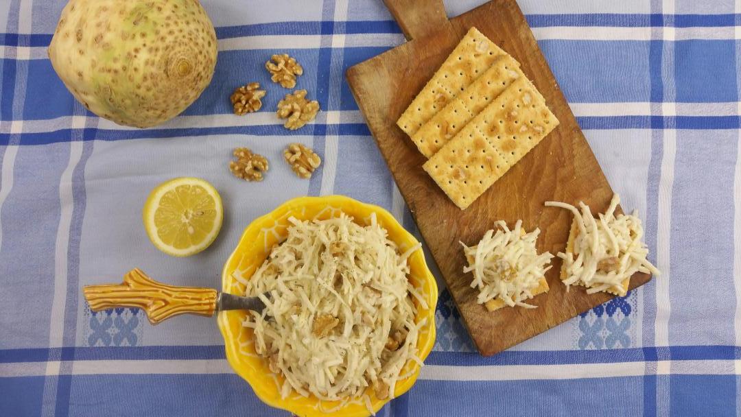 1 kleine knolselderij, 5o g walnoten, 1 tl mosterd, 150 g yoghurt, 2 el olijfolie, p&z, citroensap naar smaak