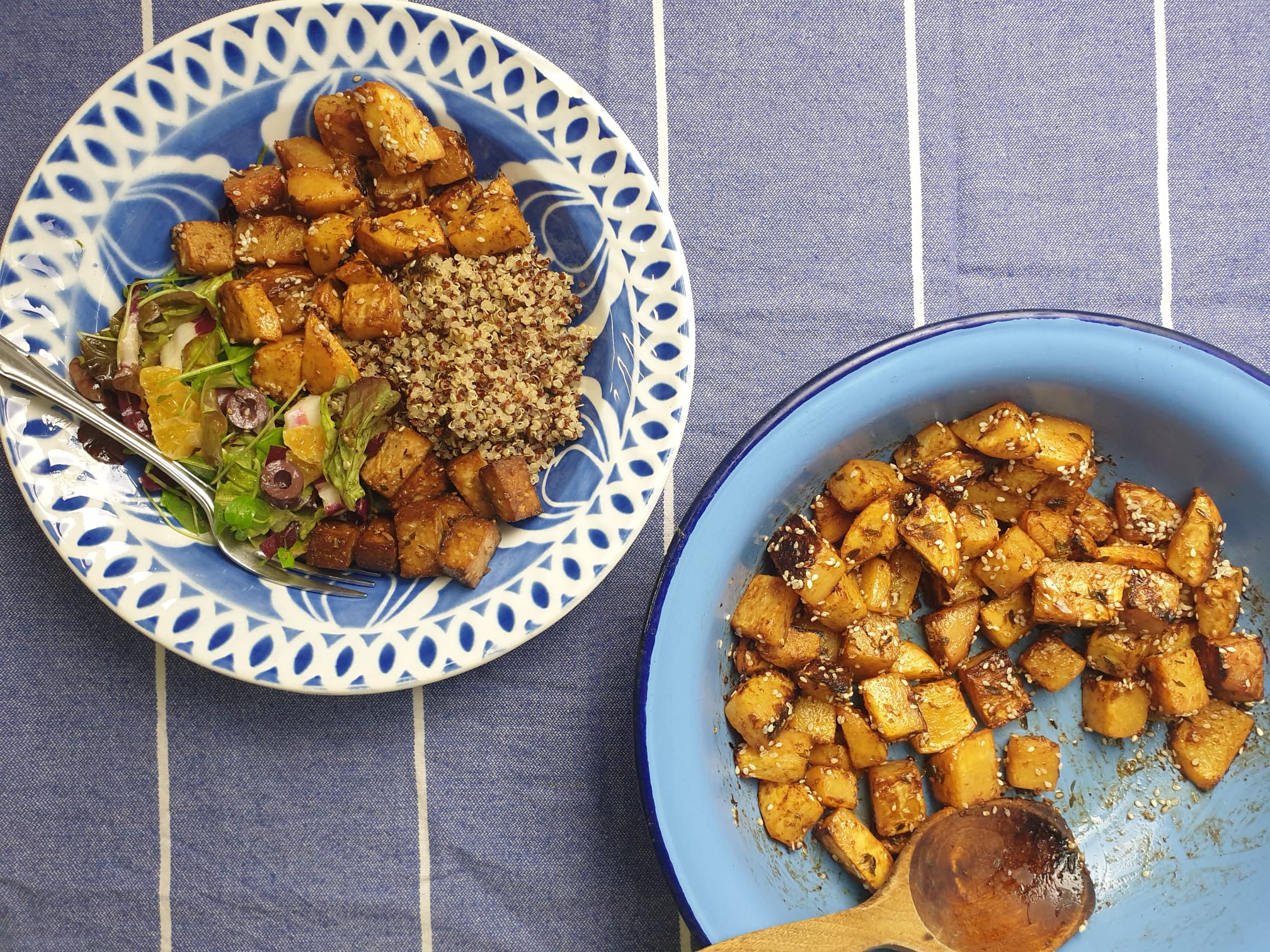 Koolraap uit de oven, met tijm en citroen, dat is lekker. Doe er nog een lepel miso over en het wordt een krachtig gerecht! Wij aten het met gebakken tofu, gekookte quinoa en een frisse salade met olijven en mandarijn en dat was een prima combinatie!