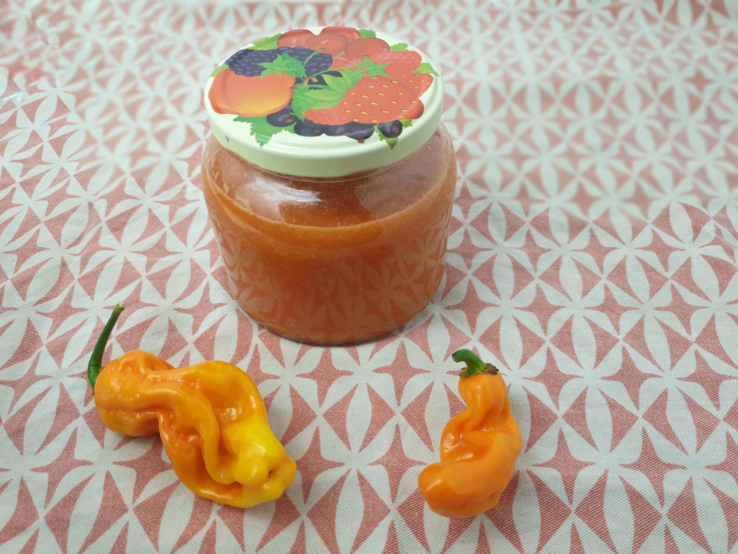 De gele Madame Jeanette pepers zijn echt lekker heet, als ik ze pluk in de kas voel ik het al aan mijn handen! Ze zijn ook geurig en aromatisch en zeer geliefd in de Surinaamse en Afrikaanse keuken. Op de schaal van Scoville, de index voor pittigheid, scoren de Madame Jeanettes ruim 125.000, tegen bijvoorbeeld 2000 punten voor de bekende sambal oelek. Pas op wanneer je ze snijdt, gebruik eventueel handschoentjes, Niet in je ogen wrijven! Branderigheid op je huid kun je verhelpen met een beetje baking soda en water. In je mond te heet? Spoelen met melk helpt beter dan water, rijst eten helpt ook. De peper stoof je een tijdje mee met een gerecht (in zijn geheel), dan geeft hij een fijne subtiele smaak af. De gekookte peper verwerkte ik tot dit sausje. Bewaar het in de koelkast en eet het bij bijvoorbeeld gekookte bootjes, bij gebakken kip, bij nasi of roti of pimp je stoofpot ermee op. je kan het gestoofde pepertje trouwens ook invriezen en dan af en toe een stukje gebruiken.