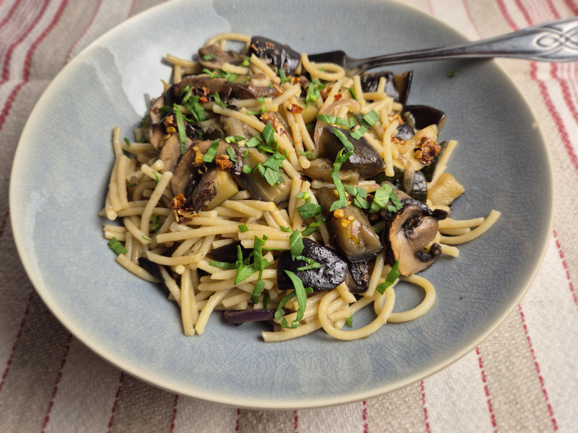 Was de aubergine en snijd in blokjes. Doe in een kom en bestrooi met een lepel zout en laat even staan. Bereid intussen de andere groente voor: veeg de paddenstoelen schoon en verwijder de wortelvoet, pel de ui en snipper deze, pel de knoflook, schrap een stukje gember en snijd in courgette in stukjes. Verwarm wat olie in een wok en bak eerst de paddenstoelen kort. Geef wat p&z en schep dan uit de wok. Zet vast water op voor de noedels. Doe opnieuw wat olie in de wok en bak de ui. Spoel de aubergine af en dep droog met een schone theedoek en voeg toe aan de wok. Bak al omscheppend en doe de courgette erbij zodra de aubergine wat begint te slinken. Rasp de gember erbij en pers de knoflook erbij. Maak intussen de noedels gaar volgens de aanwijzing op het pak. Voeg de oestersaus toe aan de groente en proef of je er nog wat aan toe wilt voeg (zoet/zout/zuur/peper?). Voeg de paddenstoelen er weer bij en roer de noedels erdoor. Serveer met een beetje groen er over gestrooid. Lekker met gebakken tofu, biologische kip of gebakken tempé!