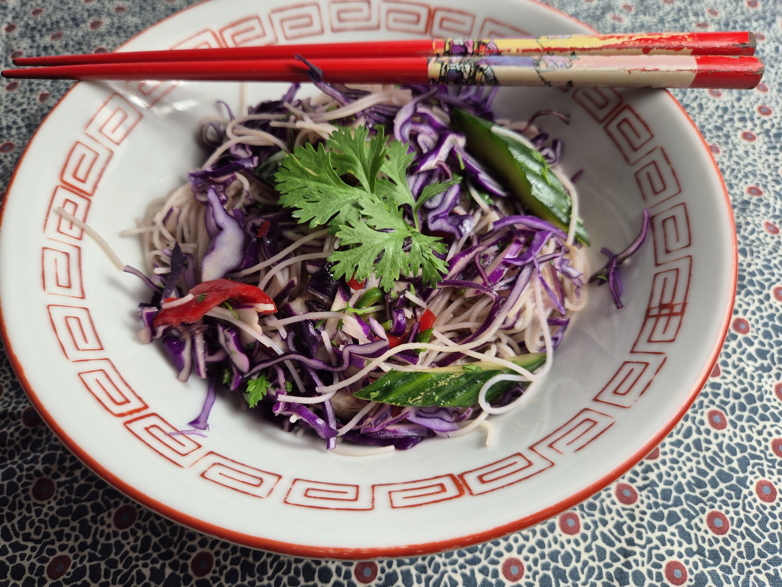 Week de noedels volgens de instructies op de verpakking, zorg dat ze wat bite houden. Spoel koud af en laat uitlekken. Was de komkommer en paprika en snijd de paprika in reepjes. Snijd de komkommer in de lengte in vieren en verwijder de zaadlijsten. Snijd in schuine repen. Maak de dressing in een ruime kom. Schaaf de rode kool zo dun als je kunt met een mandoline of keukenmachine (of gebruik een groot, scherp mes). Meng de kool met de dressing, kneed even een beetje met je handen. Hak de koriander fijn. Eventueel snijd je ook nog een beetje rode peper in heel dunne reepjes. Meng de paprika, komkommer, peper en noodles door de kool en proef.