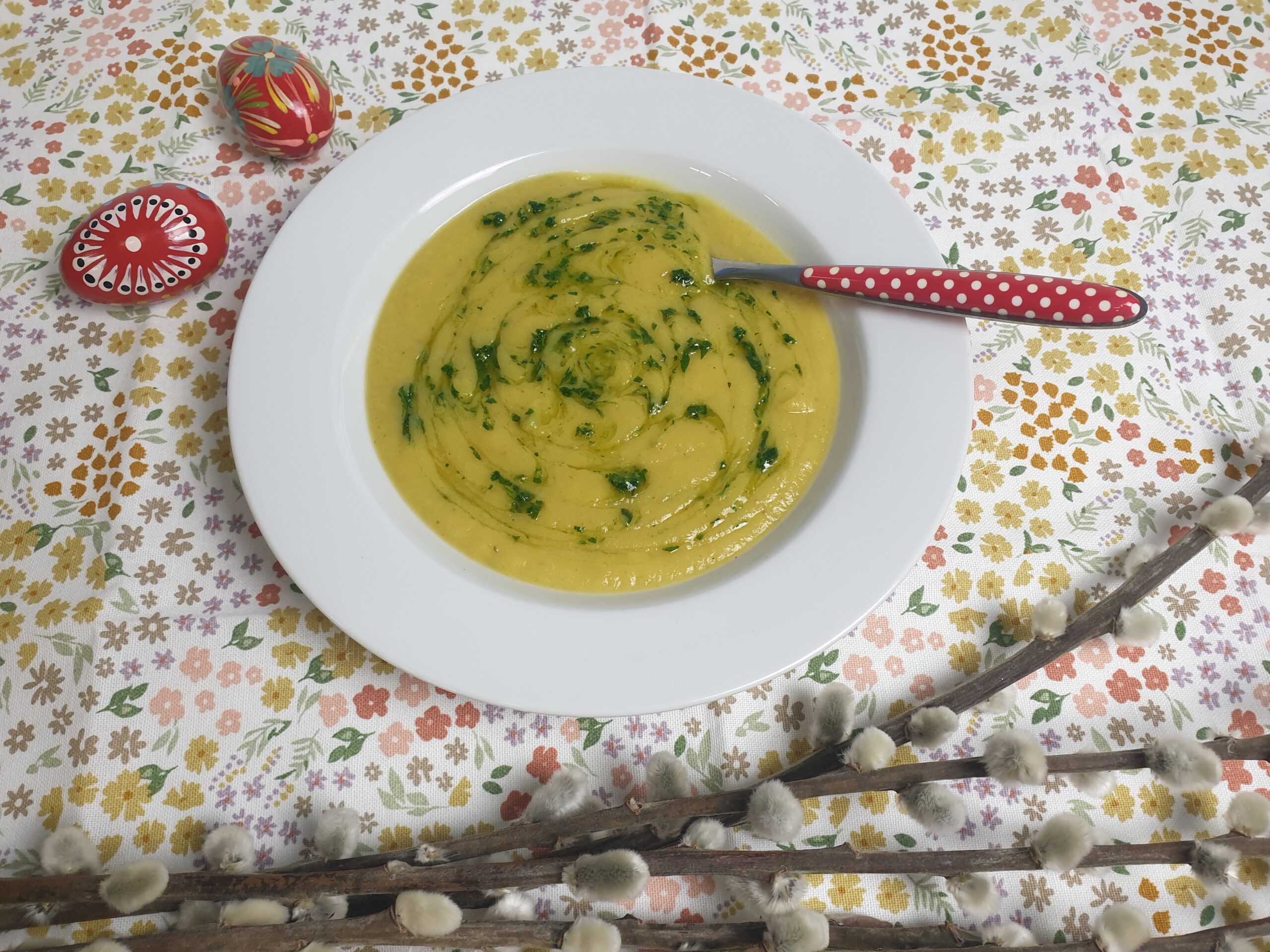 We twijfelden even om pastinaak in het pakket te stoppen, maar de gewone peen was niet leverbaar en bovendien willen we toch met zijn allen lokaal eten en klimaatbewust doen? Nou, dan moet de pastinaak nog even op, we kunnen tenslotte niet alleen maar raapsteeltjes en rucola eten, de stevige groenten komen nu nog niet vers van het land. Trouwens, de peterselie op ons land groeit ook lekker door en dat was meteen de inspirator voor deze paas-tinaaksoep. En hoewel pastinaak in Huize Kievit een wat minder geliefde groente is, kreeg dit soepje een prima waardering.