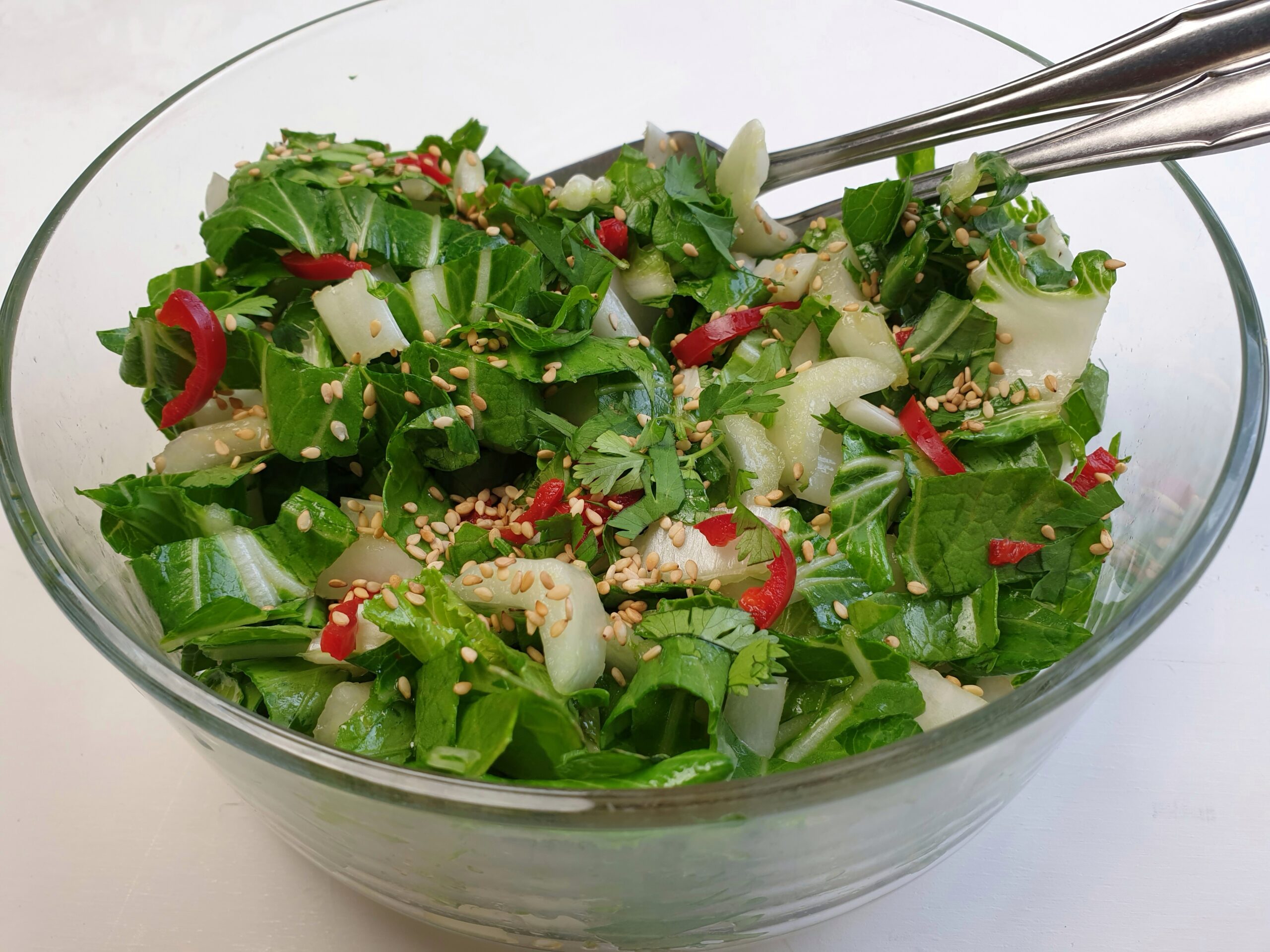 Paksoi, mijn favoriet voor snelle maaltijden. Meestal belandt hij in de wok, maar eigenlijk is hij ook rauw heel lekker en dat gaat nóg sneller! Snijd hem tamelijk fijn, dat eet beter in een salade.