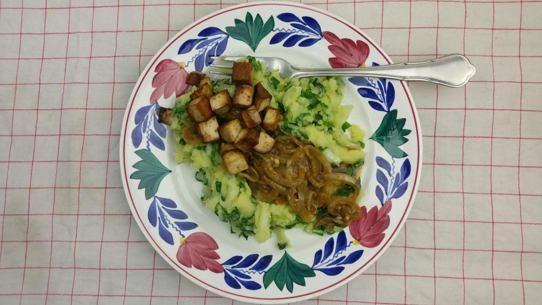 Wat maakt de stamppot nou echt fijn? Dat is de jus natuurlijk! Als je vegetarisch wilt eten kan dat nog een hele uitdaging zijn. Deze eenvoudige uienjus doet het heel goed met deze stamppot en bijvoorbeeld gebakken tofublokjes, maar ook met andijvie in de puree wordt het fijn.