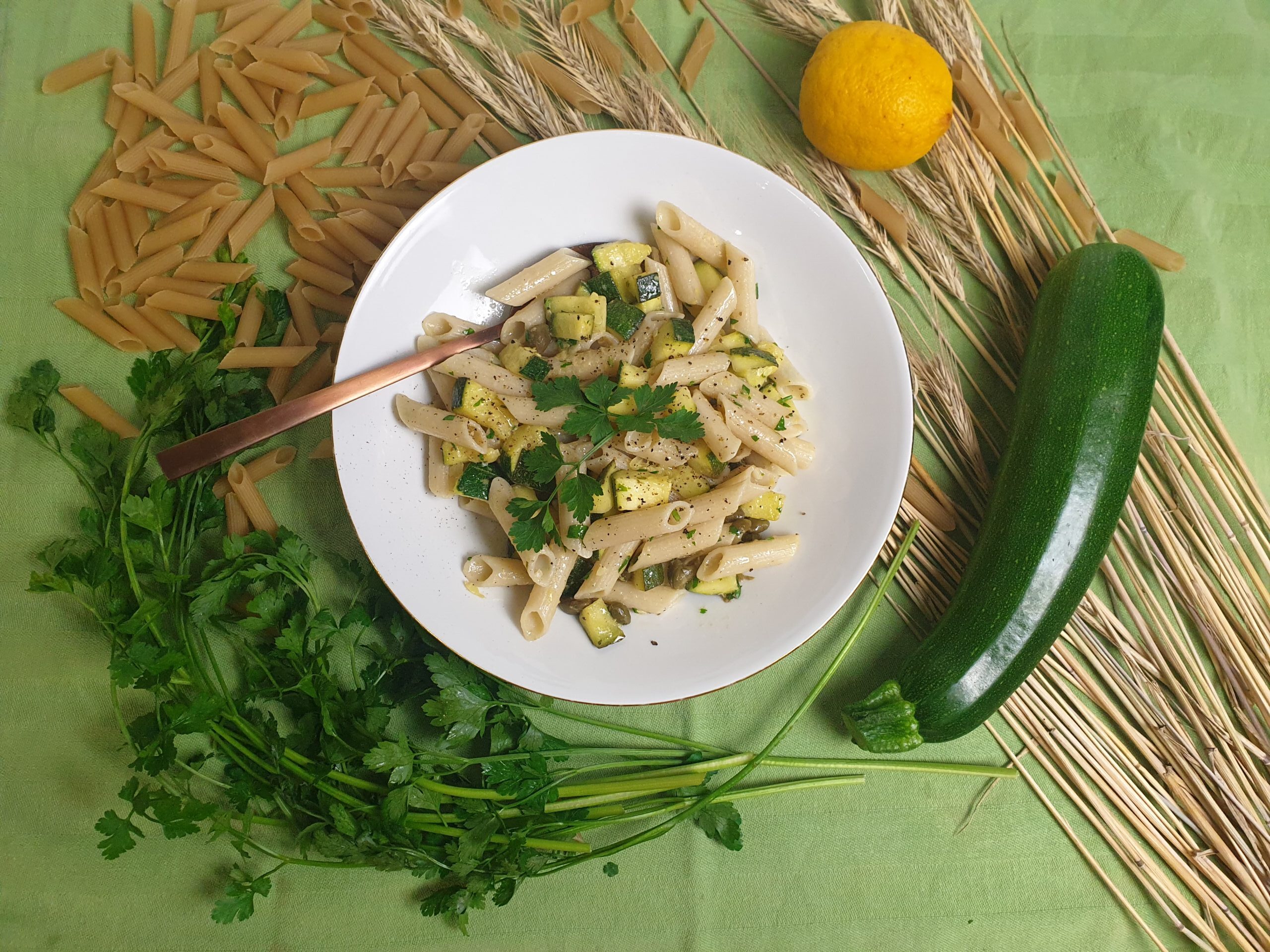 Breng ruim water aan de kook voor de pasta in een pan. Was de courgette en de peterselie en pel de knoflookteentjes. Snijd de courgette in blokjes en hak de knoflook fijn. Zodra de pasta kookt, begin je met de courgette. Verhit een scheut olie in een koekenpan en bak de knoflook heel even aan en voeg dan de courgette toe. Bak al omscheppend en doe voor 5 min. de deksel op de pan en het vuur laag. Hak intussen de peterselie fijn. Voeg dan citroenrasp, de uitgelekte kappertjes, peterselie en citroensap naar smaak toe en wat p&z. Giet de pasta af en meng door de courgette. Serveer met wat extra vergine olijfolie en eventueel wat geraspte kaas of edelgistvlokken.