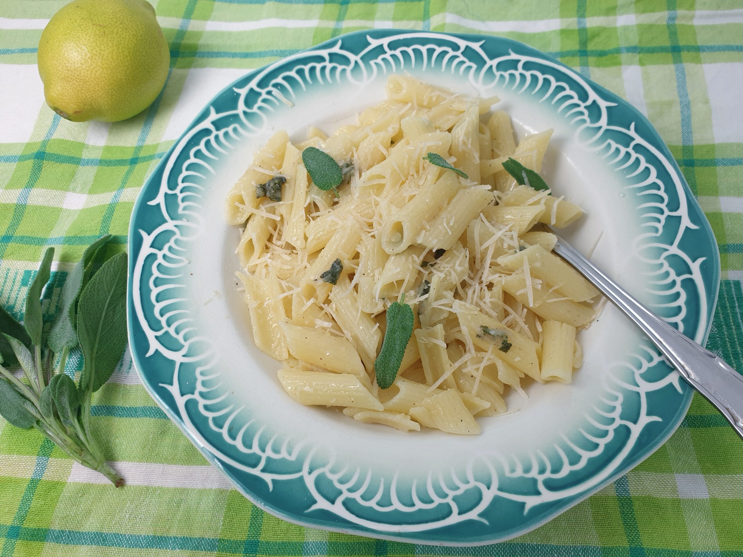 In Italië wordt heus niet alleen maar pasta en pizza gegeten, want het is een geweldig groenteland, ontdekten wij deze zomer. De pasta is vaak een aparte gang en dan krijg je een kleine portie met goede pasta, soms heel eenvoudig klaargemaakt, zoals deze klassieker: “Pasta alla Salvia e Burro”. Zaak is dan wel om te kiezen voor echt goede ingrediënten, dat betekent: een goede pasta (liefst verse), echte boter, goede Parmezaan en natuurlijk een biologische citroen. Het is zo klaar en een leuke manier iom iets te doen met de salie in je pakket! Lekker met salade erbij, of eet die vooraf, zoals de Italianen dat ook doen!
