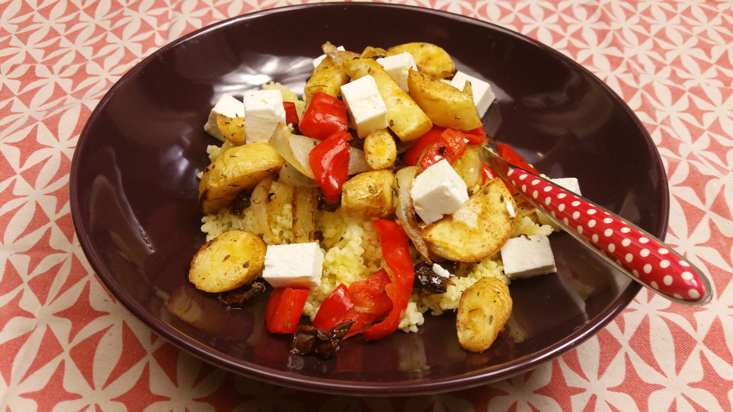 750 g pastinaak, 2 uien, 1 rode paprika, 1 pakje feta, 30 g gedroogde tomaat, 4-6 el olijfolie, 1 tl anijs, 1 tl gemberpoeder, ¼ tl kaneelpoeder, ¼ tl gerookte paprikapoeder, ¼ tl chilipoeder of een stukje peper, 1½ tl gedroogde tijm